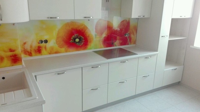 Угловая кухня выполнена на заказ, так как помещение имеет нестандартные выступы в стене, что очень усложняет процесс выбора классической кухни. Фасад имеет матовую белую поверхность, которая смотрится очень изящно и мило в дополнении со скиналью с ярким цветочным рисунком. Ручки хромированные, в форме дуги.