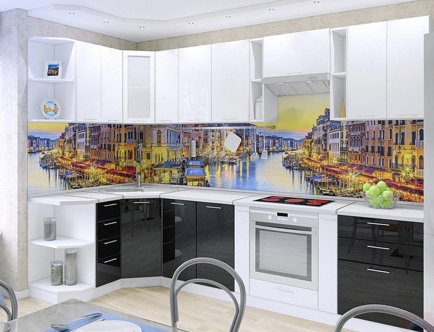Модель кухни имеет довольно строгий вид цветовой гаммы: белый верх, черный низ, который смотрится очень выигрышно в абсолютно любом помещении, так как визуально не загромождает и не давит на пространство. Конструкция кухни угловая, поэтому имеется очень просторная рабочая поверхность. Столешница выполнена также в белом цвете и прекрасно сочетается со скиналью с фотопечатью «Венеция».