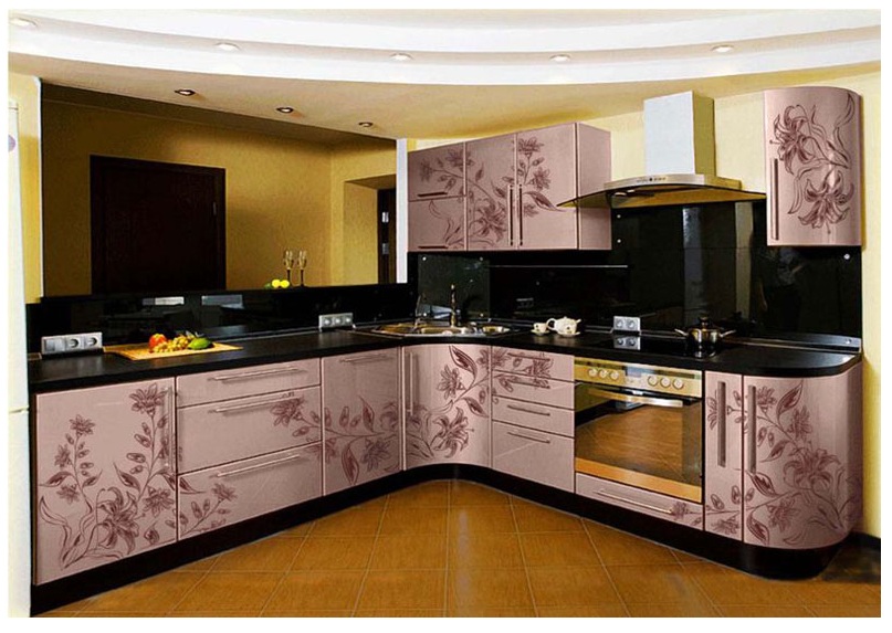 Фасад кухни выполнен в дымчато-розовом цвете, с нанесенным крупным цветочным рисунком в виде бутонов лилии. Такой дизайн подходит страстным и легким на подъем людям, видящим во всем только позитив. Конструкция кухни угловая, с радиусными углами, также имеются многочисленные ящики и ниши для техники. Конечная цена рассчитывается исходя из материалов и в расчете на метр погонный.