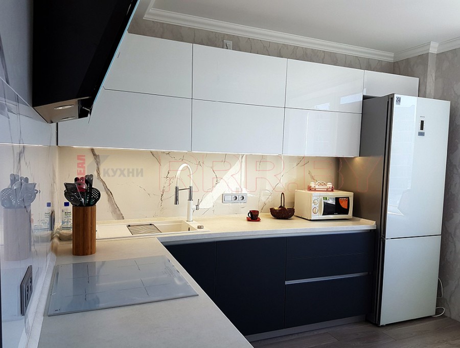 Угловая модель кухни в комбинированном цвете. Фасады без ручек. Навесные шкафчики.