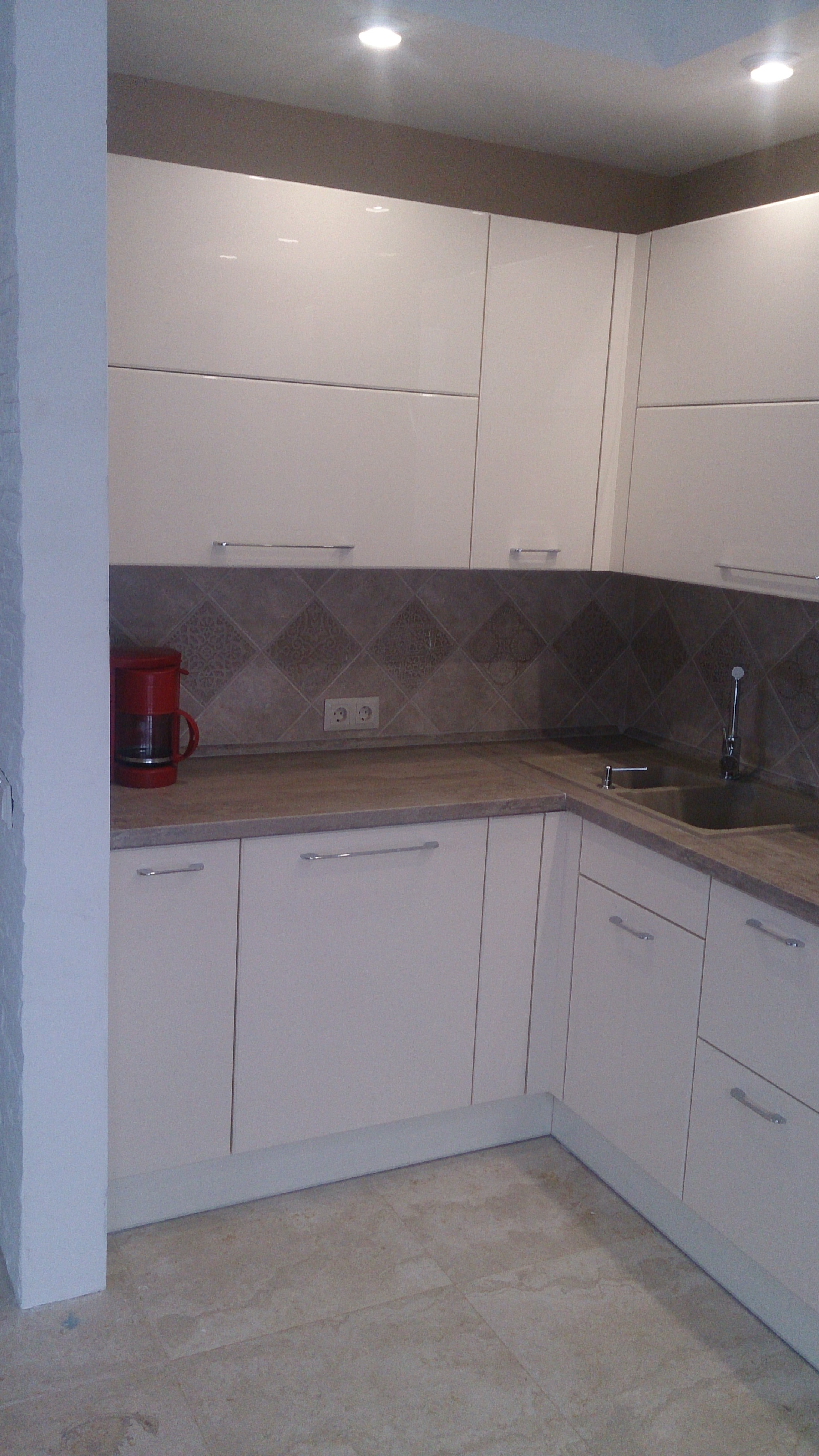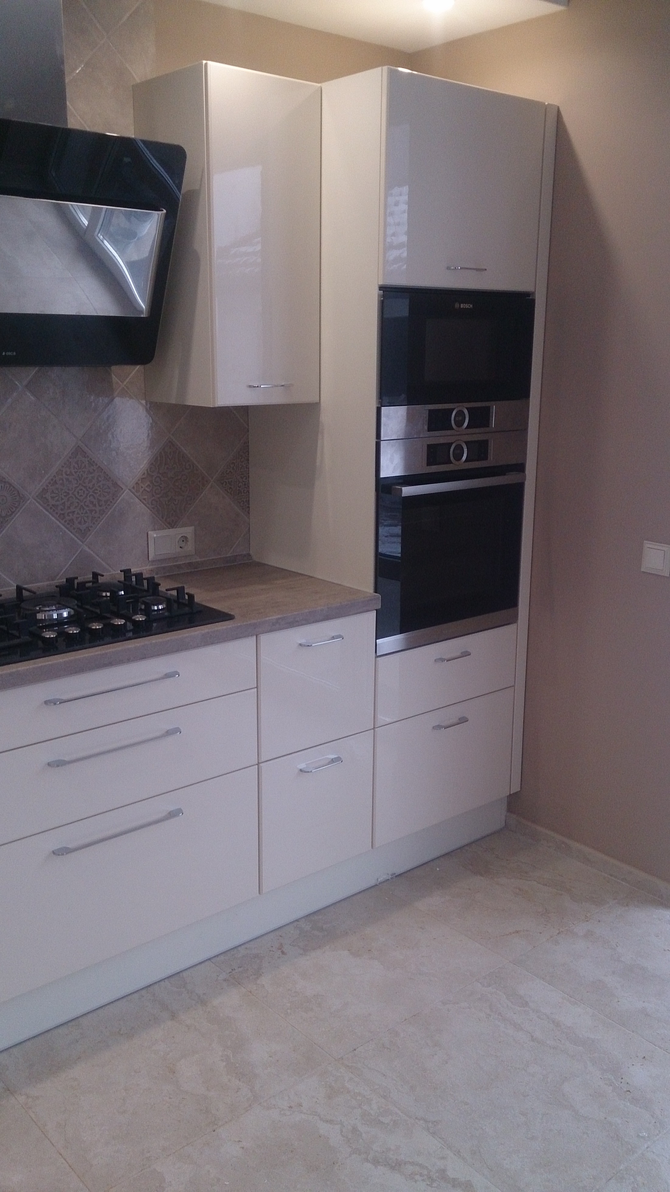 Белая угловая кухня в минималистичном исполнении. В торце распложен шкаф для встроенной техники. Столешница под камень бежевого оттенка с выемкой для врезной мойки. Фасады с тонкими длинными металлическими ручками.