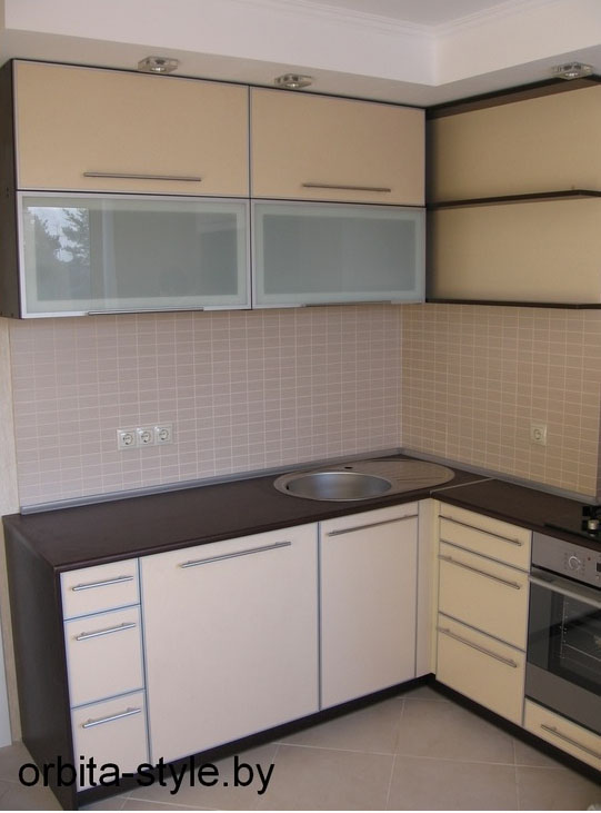 Верхние фасады со стеклом. Ширина кухни 210 см.