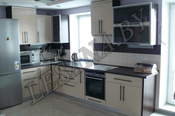 Удобные металлические ручки в цвете «сатин». Ширина кухни 230 см.