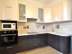 Глянцевые фасады розового цвета, вместительные шкафчики, удобная фурнитура.