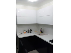 Кухня фабричная с раздельной столешницей. Два ряда навесных шкафов.