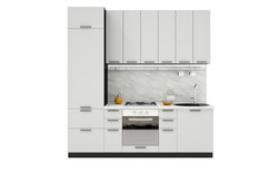 Белые фасады с фрезеровкой. Ширина кухни 210 см.