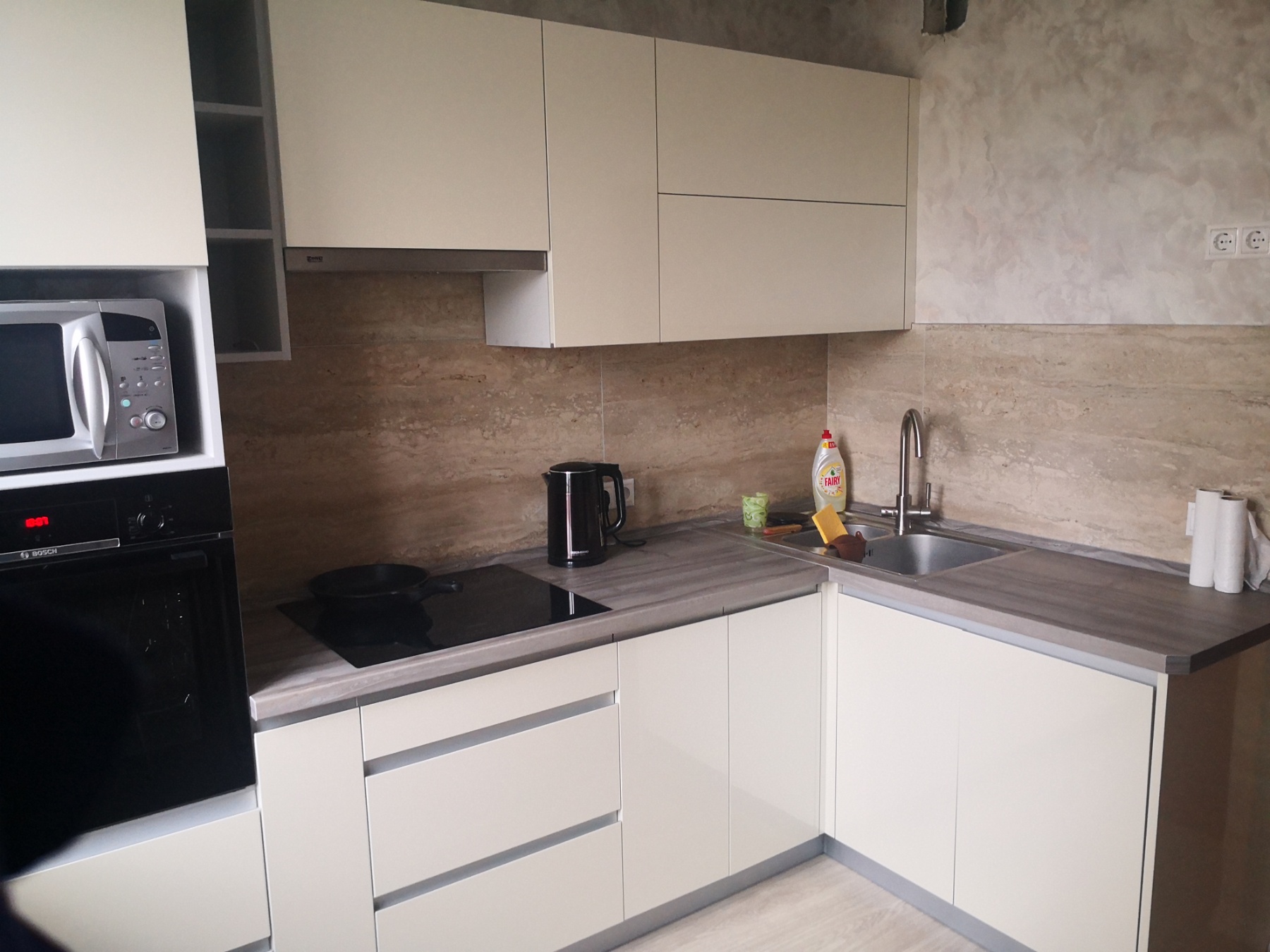 Лаконичный гарнитур с фасадами мягкого серого оттенка.