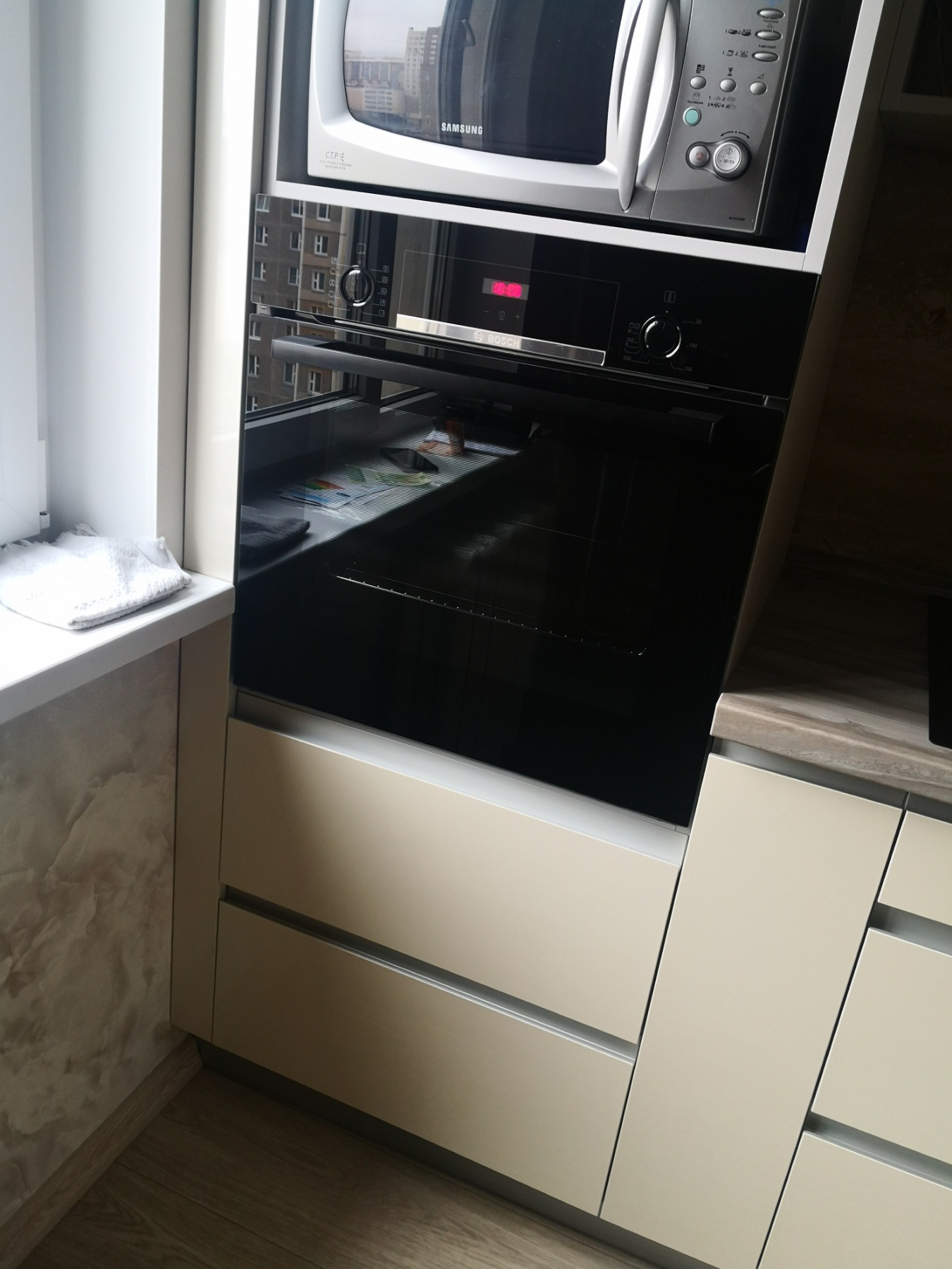 Прямая белая кухня с пеналом для техники