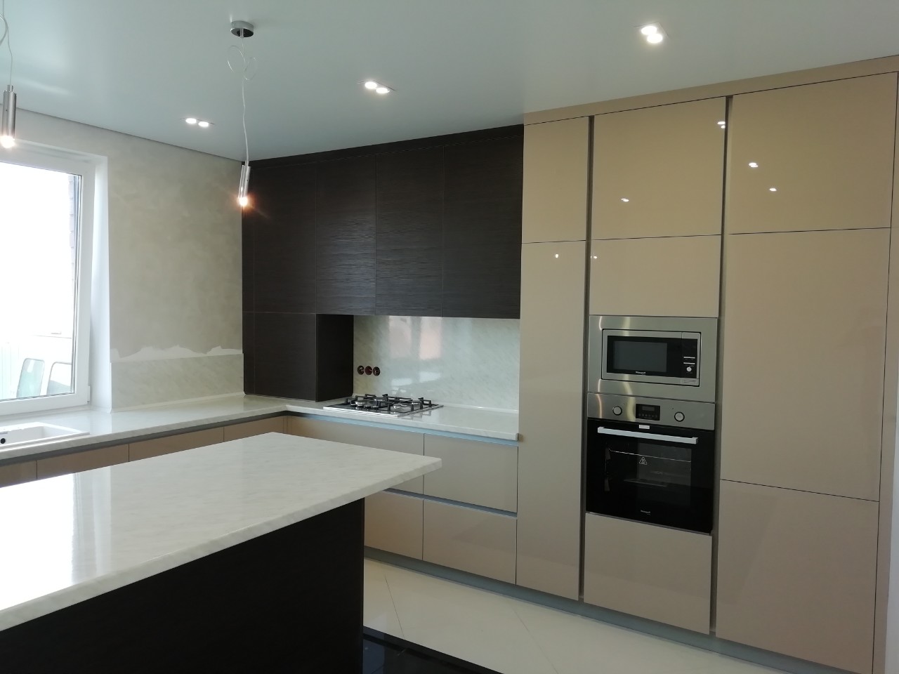 Верхние фасады без ручек, нижние – с ручками из металла.