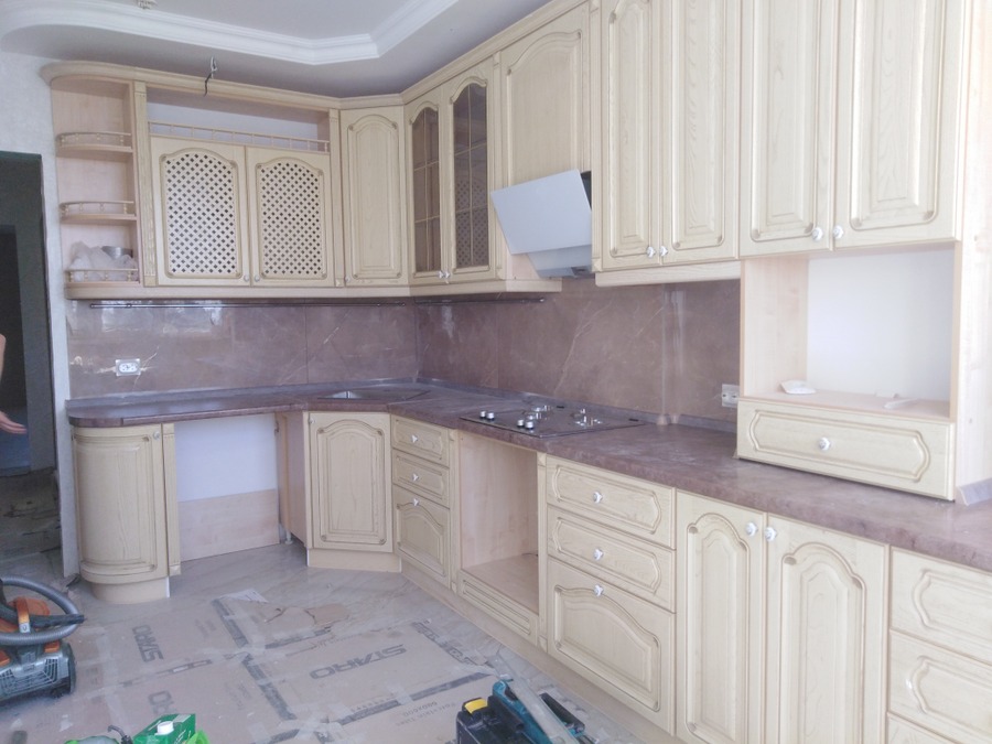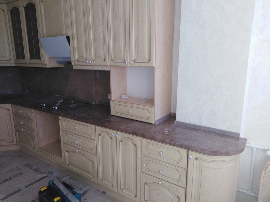 Массивные ручки. Наличие отделений для варочной панели и духовки.