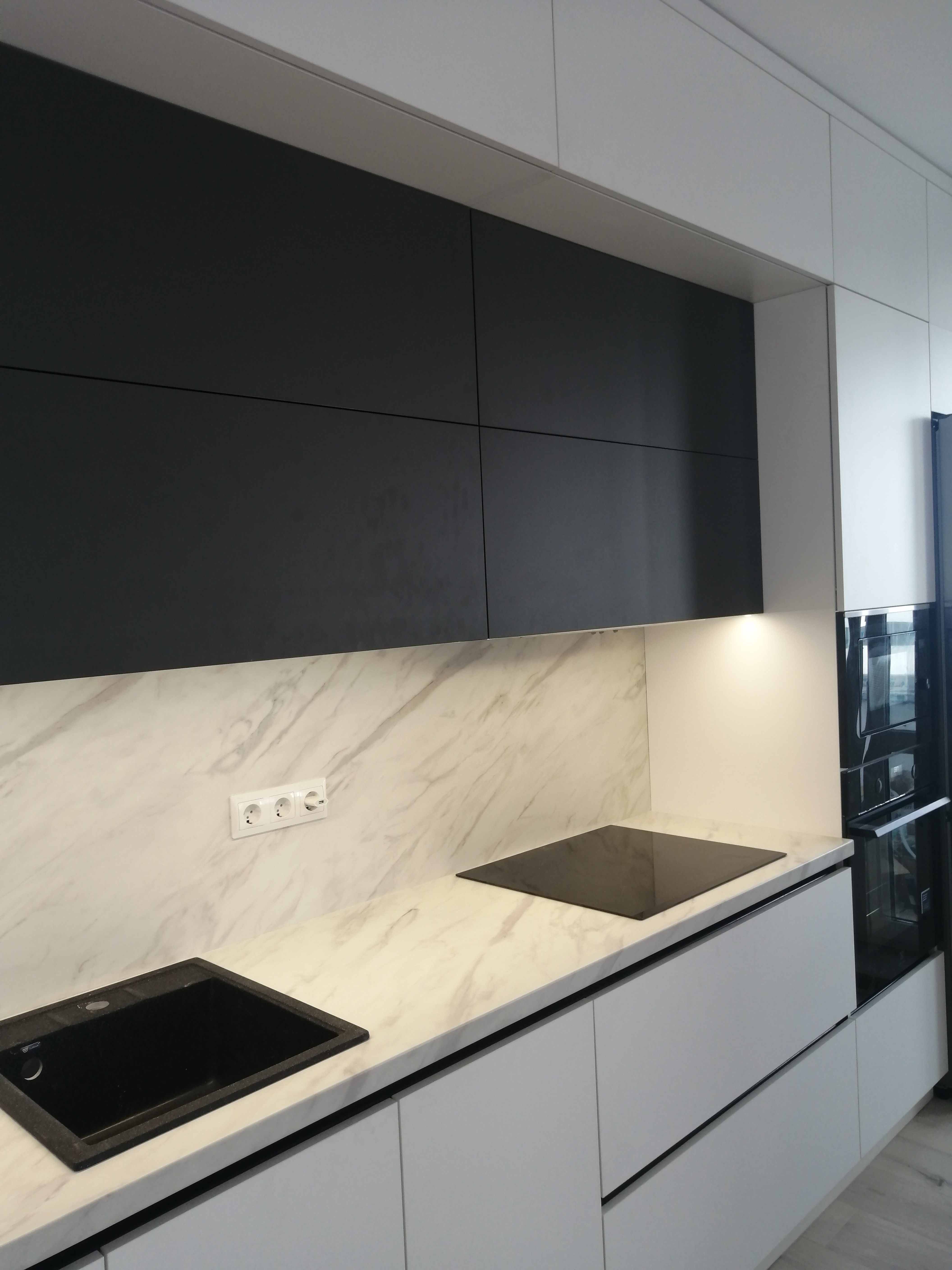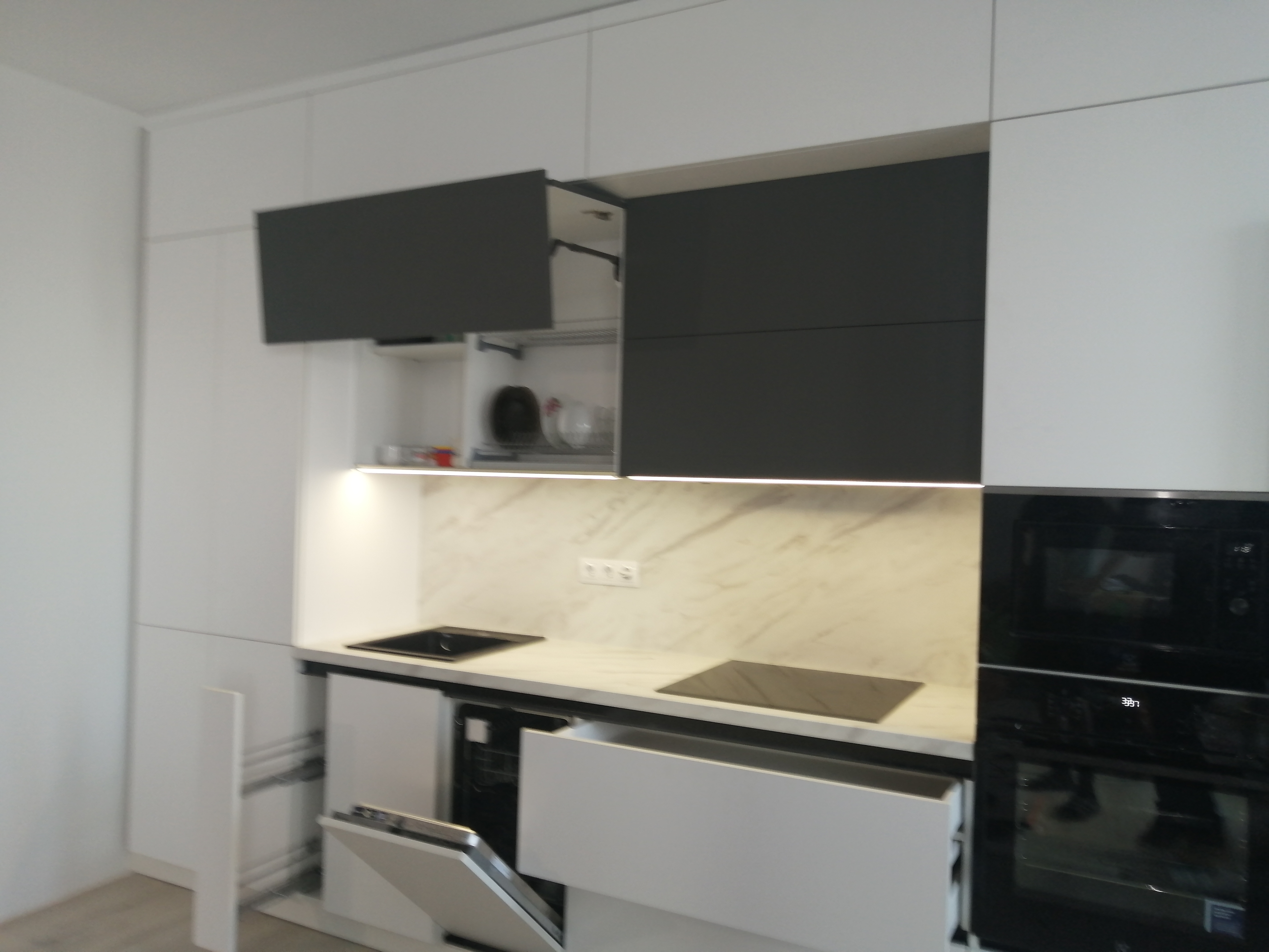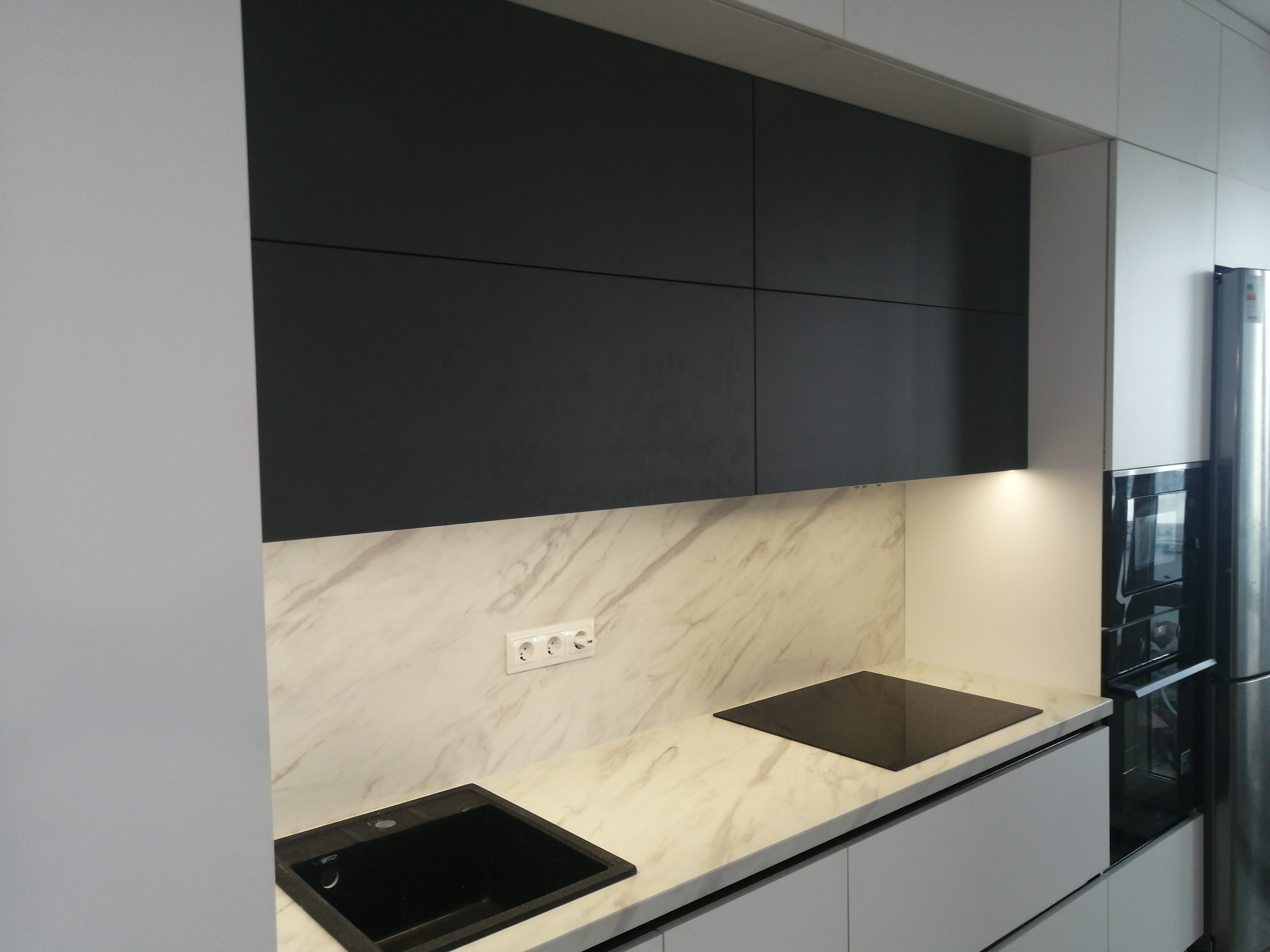 Кухня линейная. Фасада АГТ белый/темно серый. Фурнитура BLUM. Столешница EGGER. Профильная ручка SCHŰCO. Открывать и закрывать ящики, шкафы, полки действительно просто; устойчивы к коррозии и идеально подходят для мебели в кухонном помещении. Постоянная влажность и температурные перепады — не угроза для первоначальных характеристик изделий. В пенал установлена система Wing Line. Впечатляющий эффект панорамы! Позволяет получить полный доступ к содержимому шкафа и подходит для всех широко используемых форматов дверных проемов. Можно применить систему WingLine L в шкафах, комодах, кухонных верхних и нижних корпусах. Врезная подсветка. Размер 3800мм.