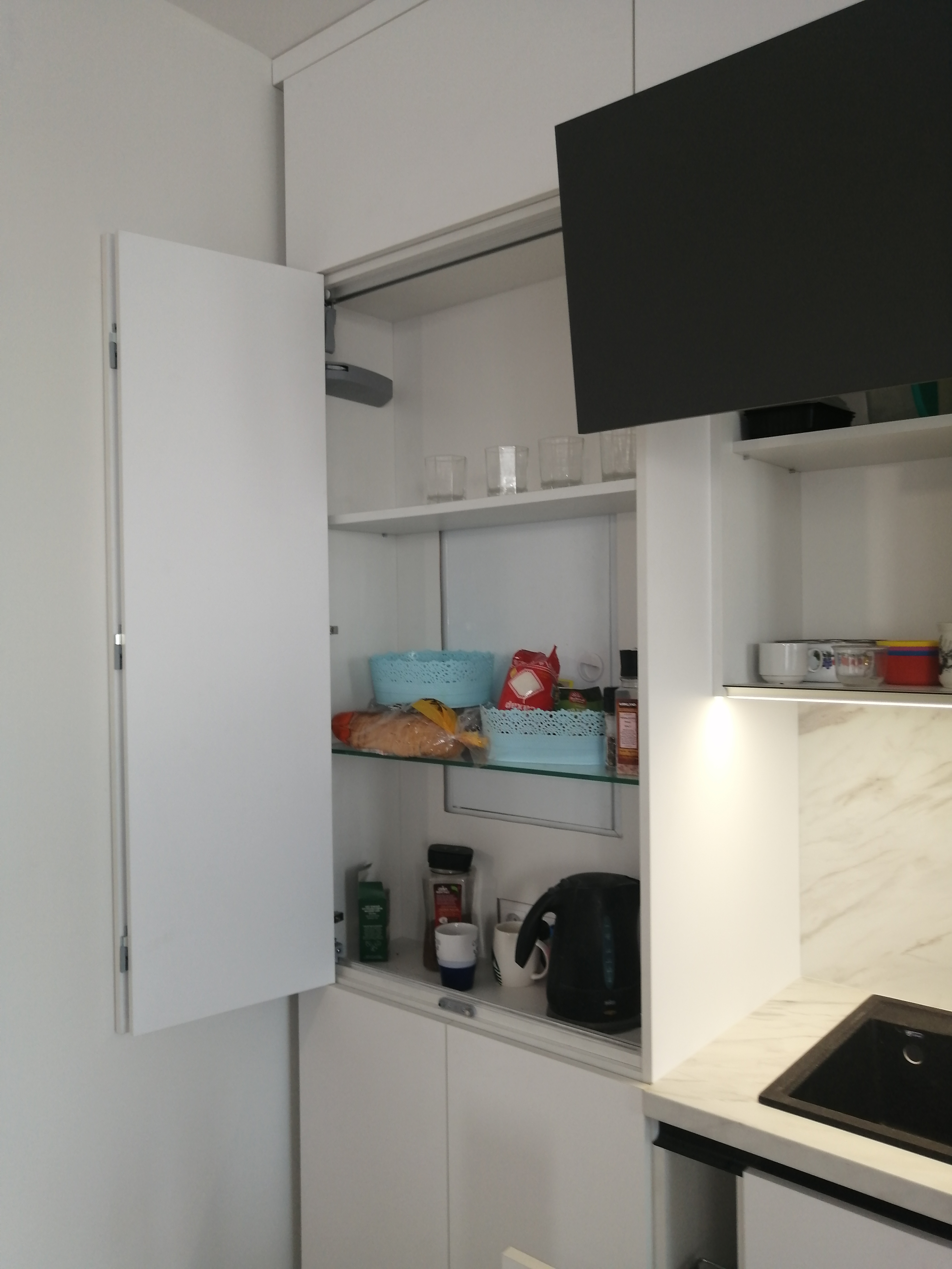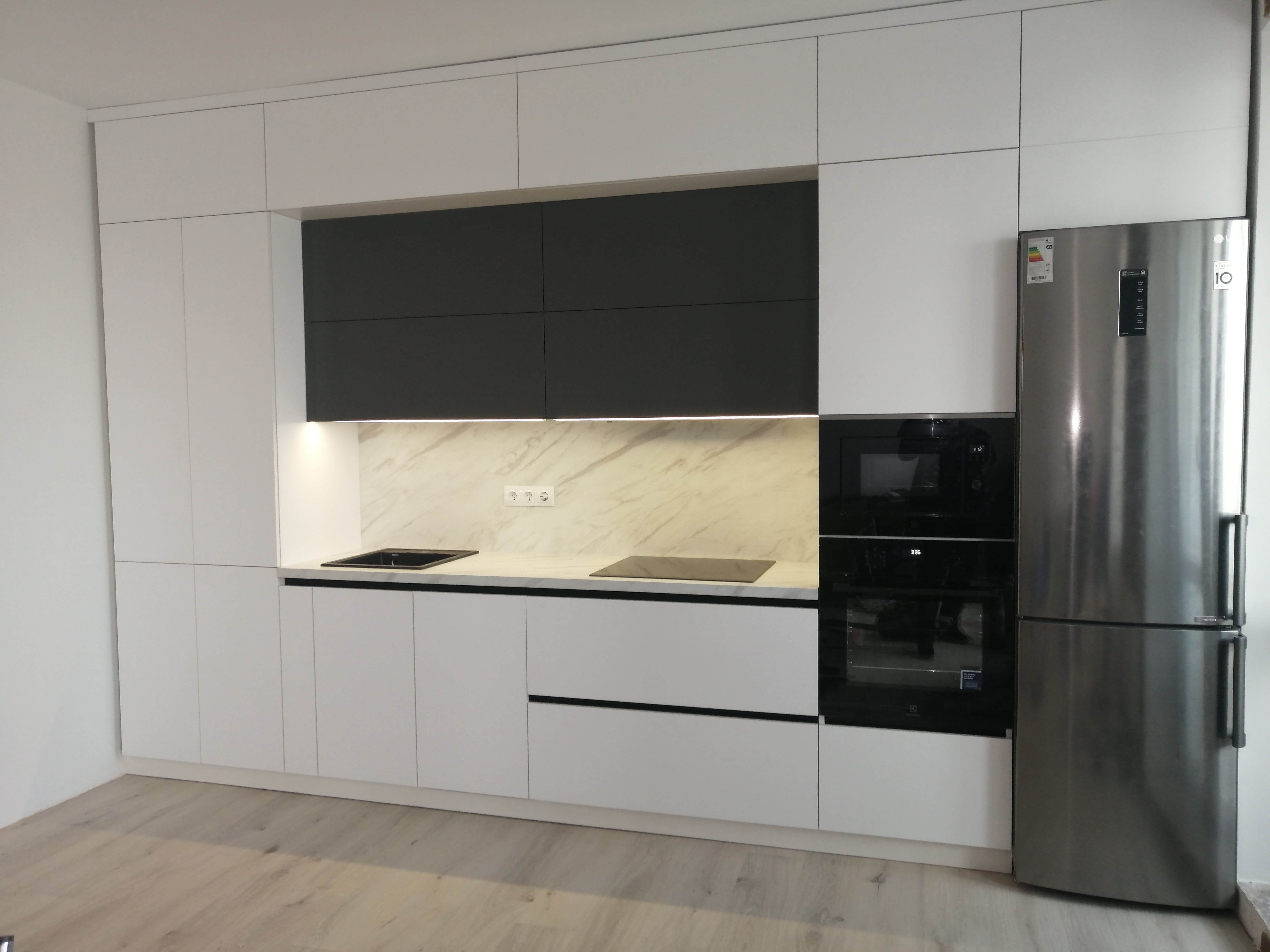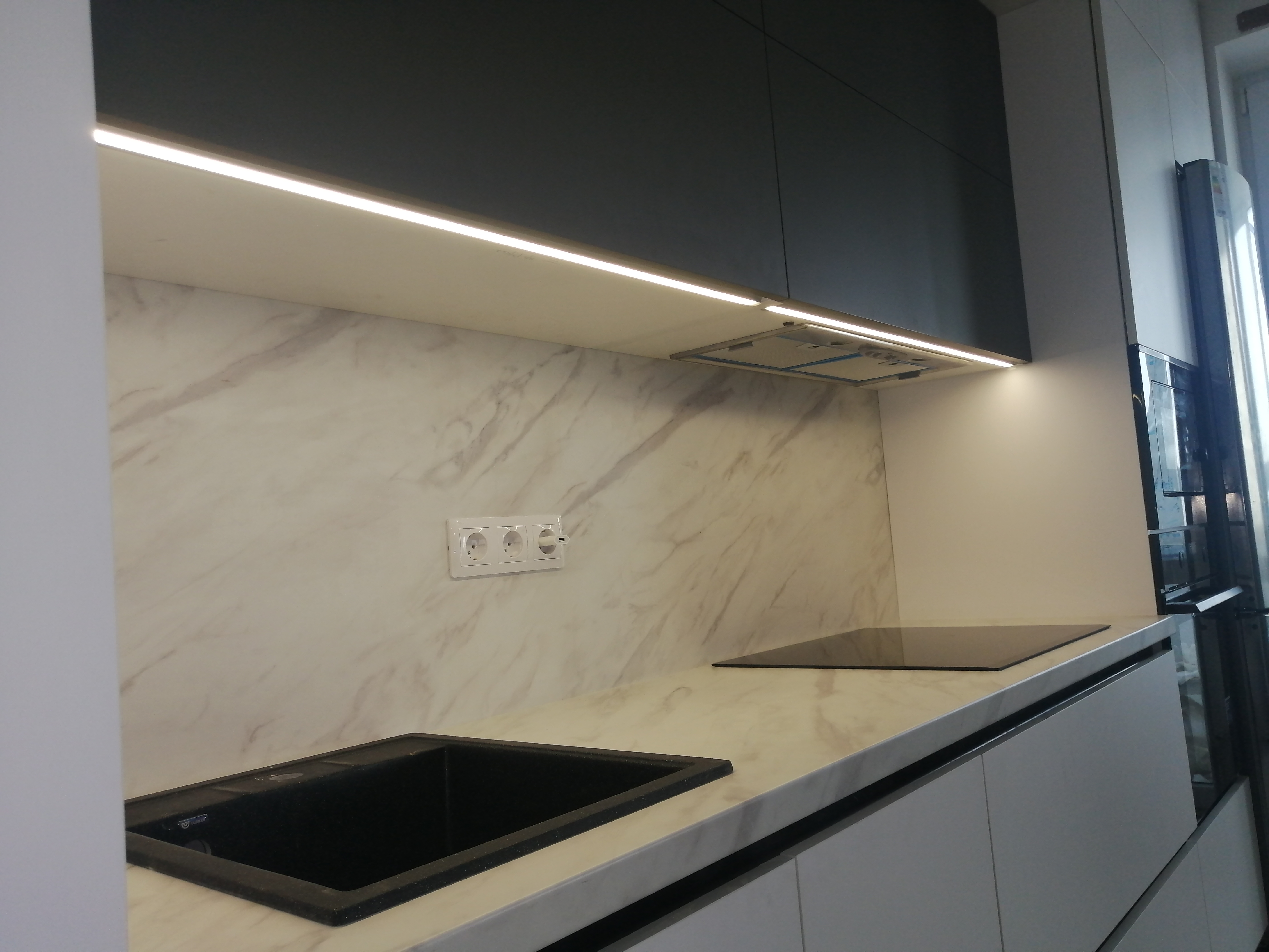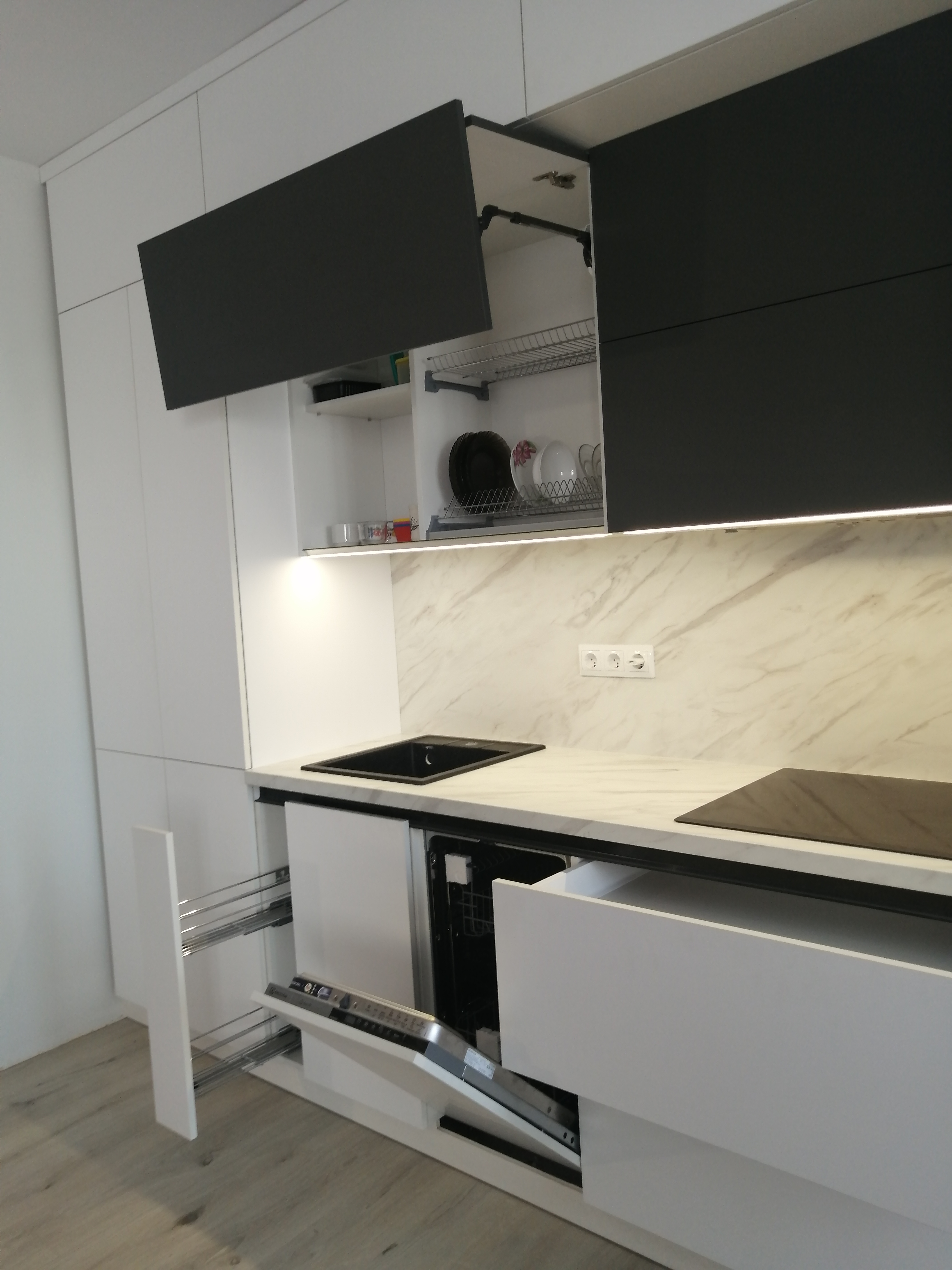 Кухня линейная. Фасада АГТ белый/темно серый. Фурнитура BLUM. Столешница EGGER. Профильная ручка SCHŰCO. Открывать и закрывать ящики, шкафы, полки действительно просто; устойчивы к коррозии и идеально подходят для мебели в кухонном помещении. Постоянная влажность и температурные перепады — не угроза для первоначальных характеристик изделий. В пенал установлена система Wing Line. Впечатляющий эффект панорамы! Позволяет получить полный доступ к содержимому шкафа и подходит для всех широко используемых форматов дверных проемов. Можно применить систему WingLine L в шкафах, комодах, кухонных верхних и нижних корпусах. Врезная подсветка. Размер 3800мм.