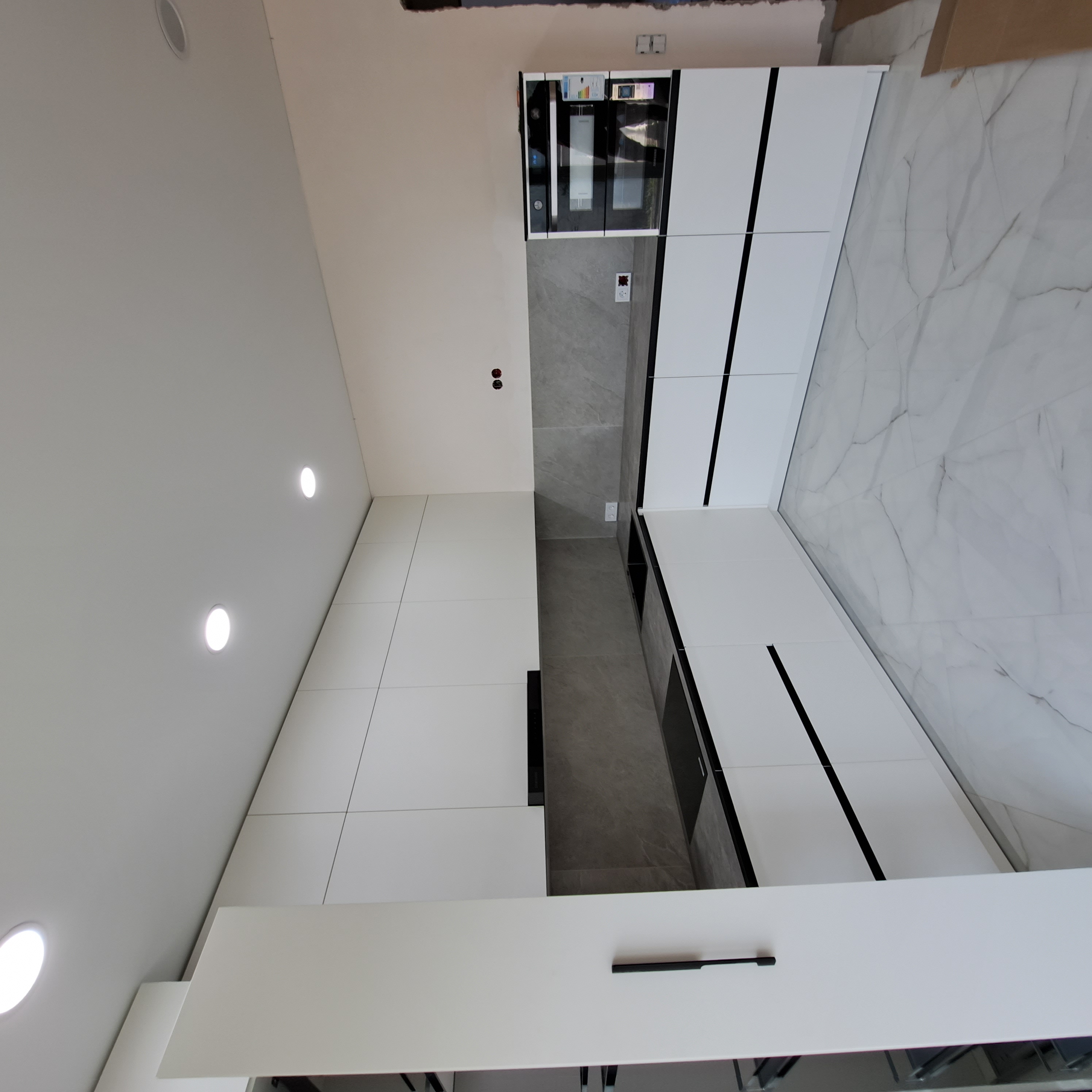 Угловая кухня с большим пеналом. Подсветка. Подвесные верхние шкафы.