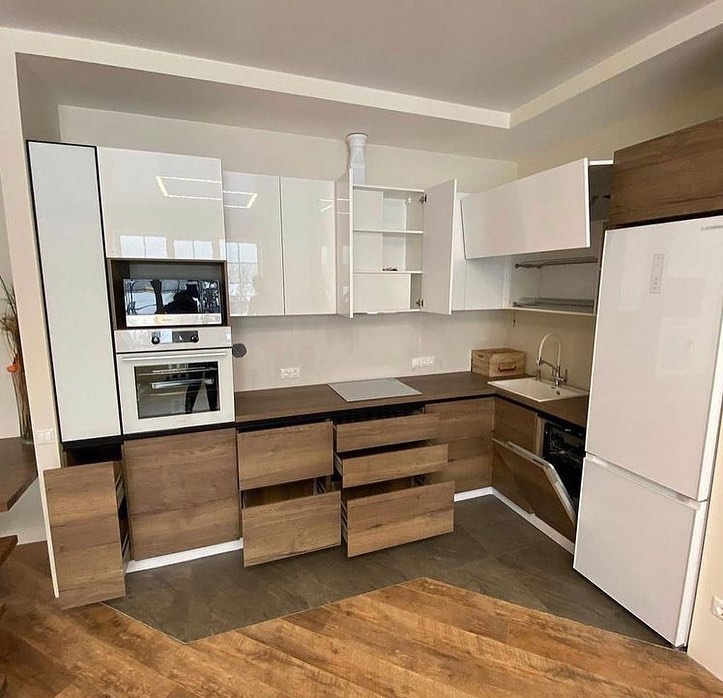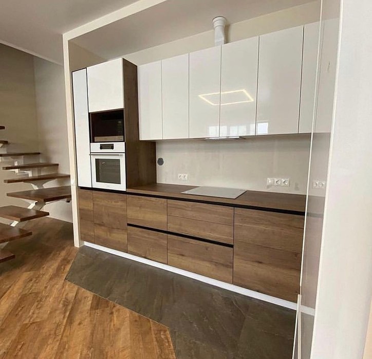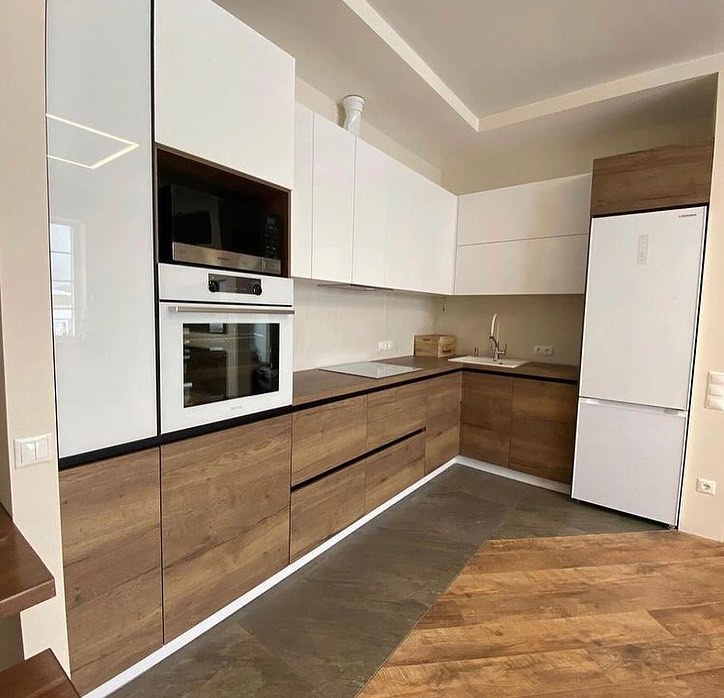 Белая кухня с деревом