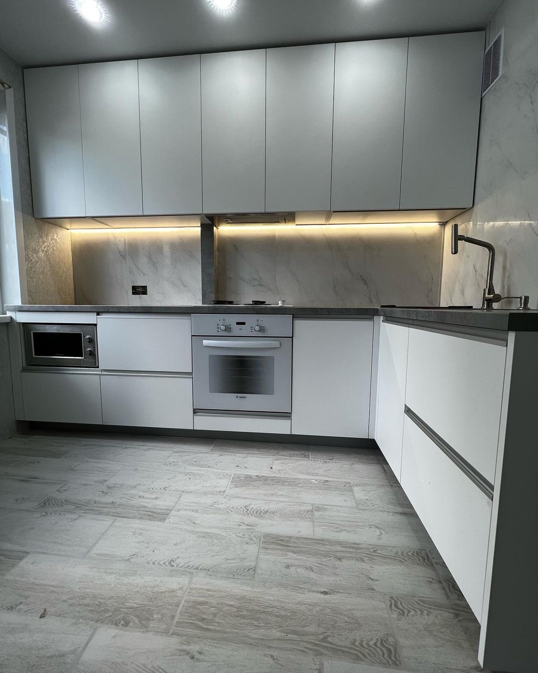 Современная кухня с навесными шкафами без ручек