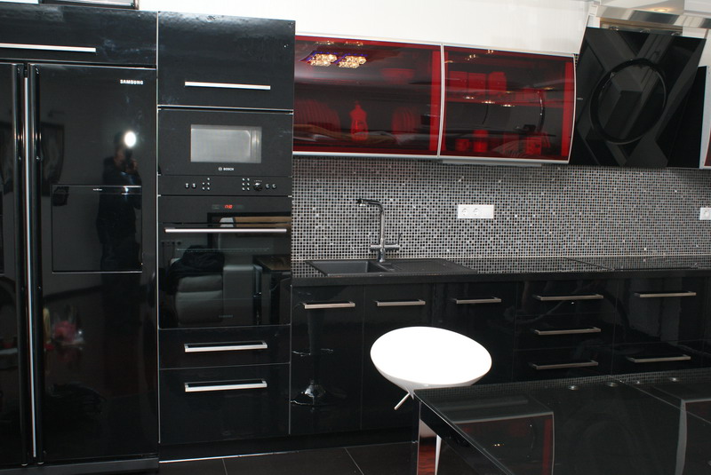 Необычайно стильный кухонный гарнитур способен коренным образом изменить существующий интерьер кухни. Черные глянцевые фасады выглядят очень эффектно и отлично дополняются элегантными вставками из красного полупрозрачного стекла. Модель имеет широкую функциональность, которая обеспечивает комфортное использование.