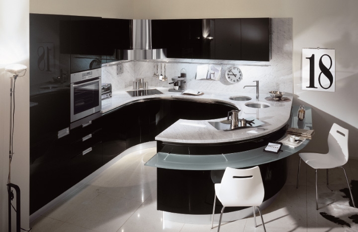 Контрастный угловой кухонный гарнитур с закругленной стойкой в глянцевом черном фасаде с белой столешницей. Оборудованы ниши для встроенного холодильника и духового шкафа, угловое расположение варочной поверхности, мойка расположена в торце впритык с барной стойкой, которая дополнена полупрозрачной стеклянной столешницей. Буфет с интергрированными ручками.