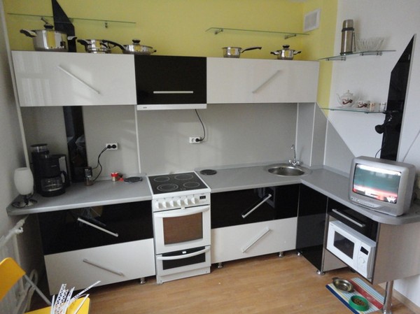 Фасады изготовлены из окрашеного МДФ. Необычное расположение ручек шкафов, стеклянные полочки и индивидуальное место для микроволновой печи делают кухню функциональной и необычной. Сочетание черного и белого цветов наполнит помещение гармонией и уютом.