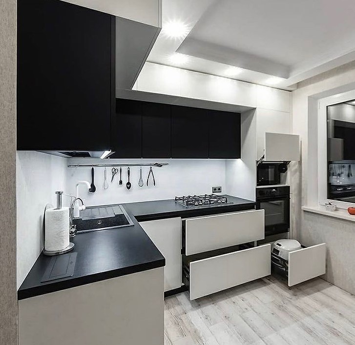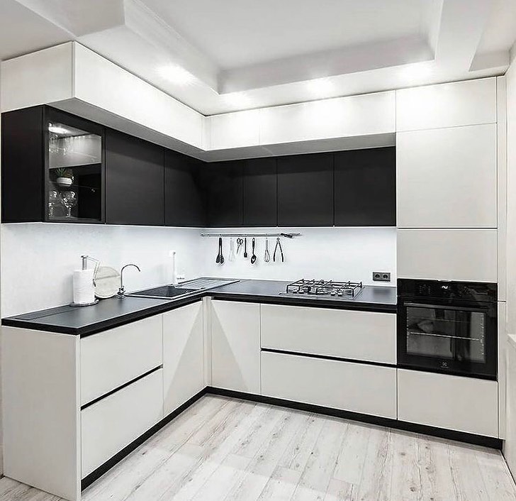 Черно-белая угловая кухня без ручек