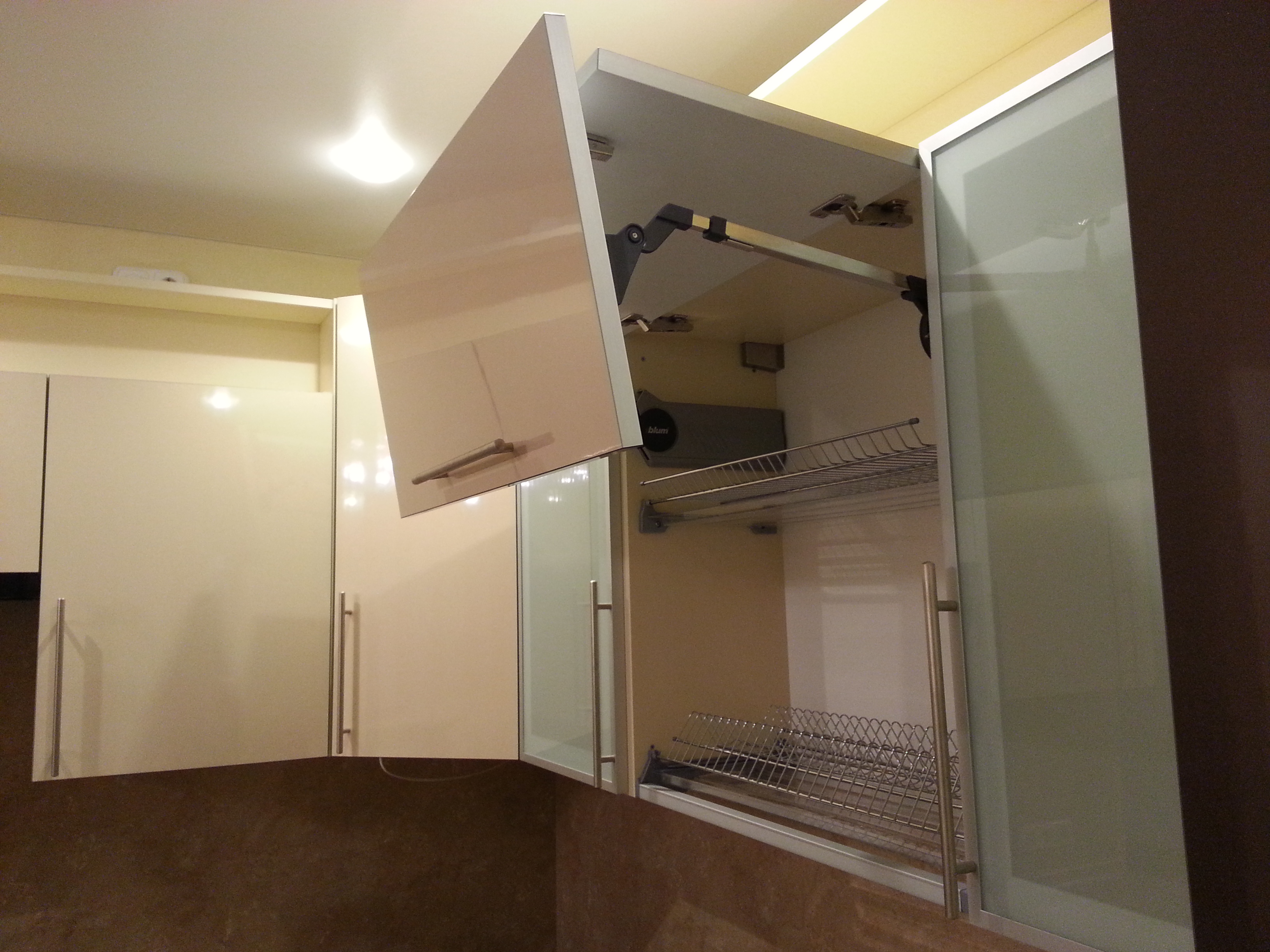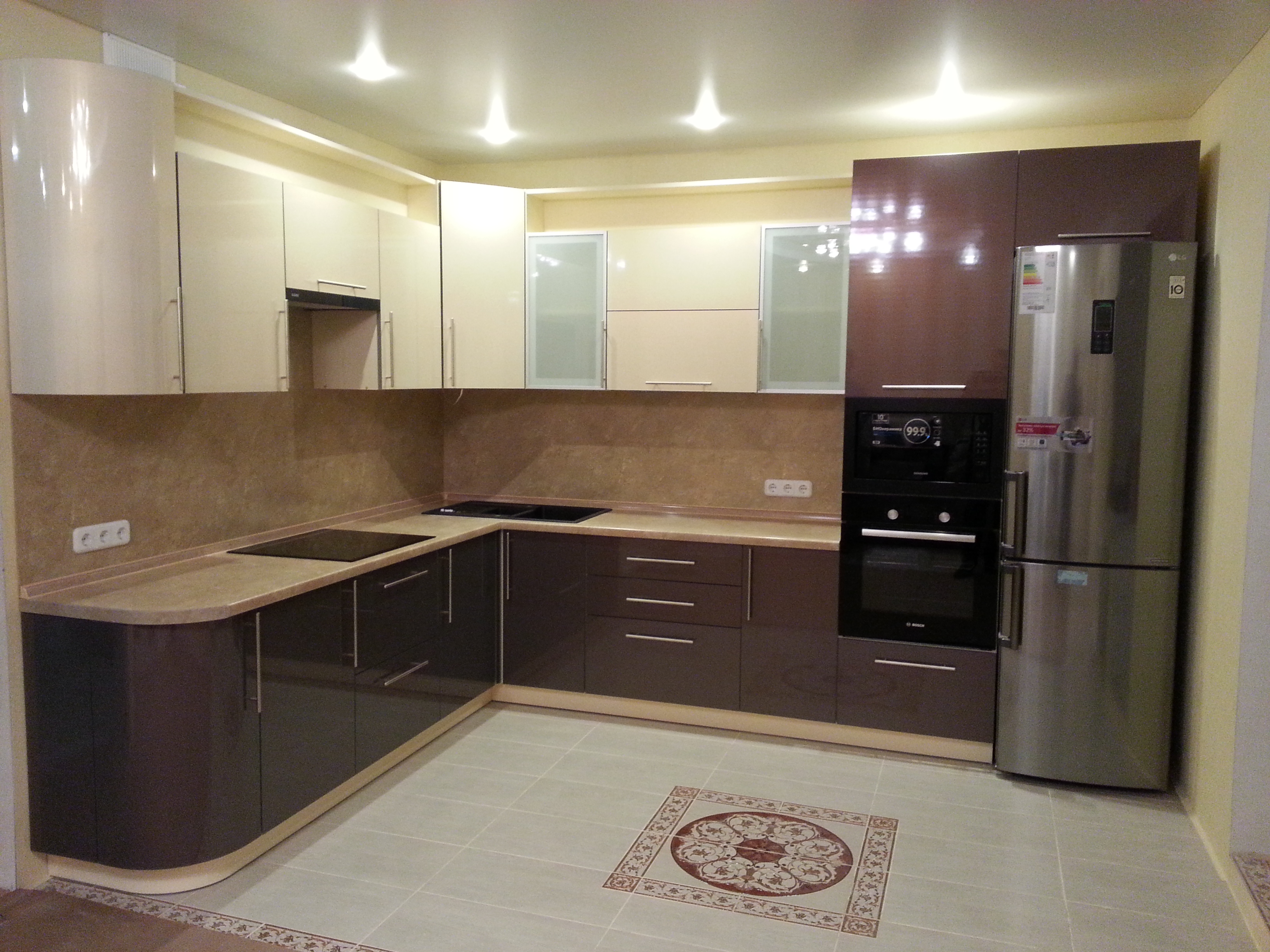код 86701Глянцевые фасады в молочно-кофейных тонах. Радиусный торец. Витрины верха из лакомата.