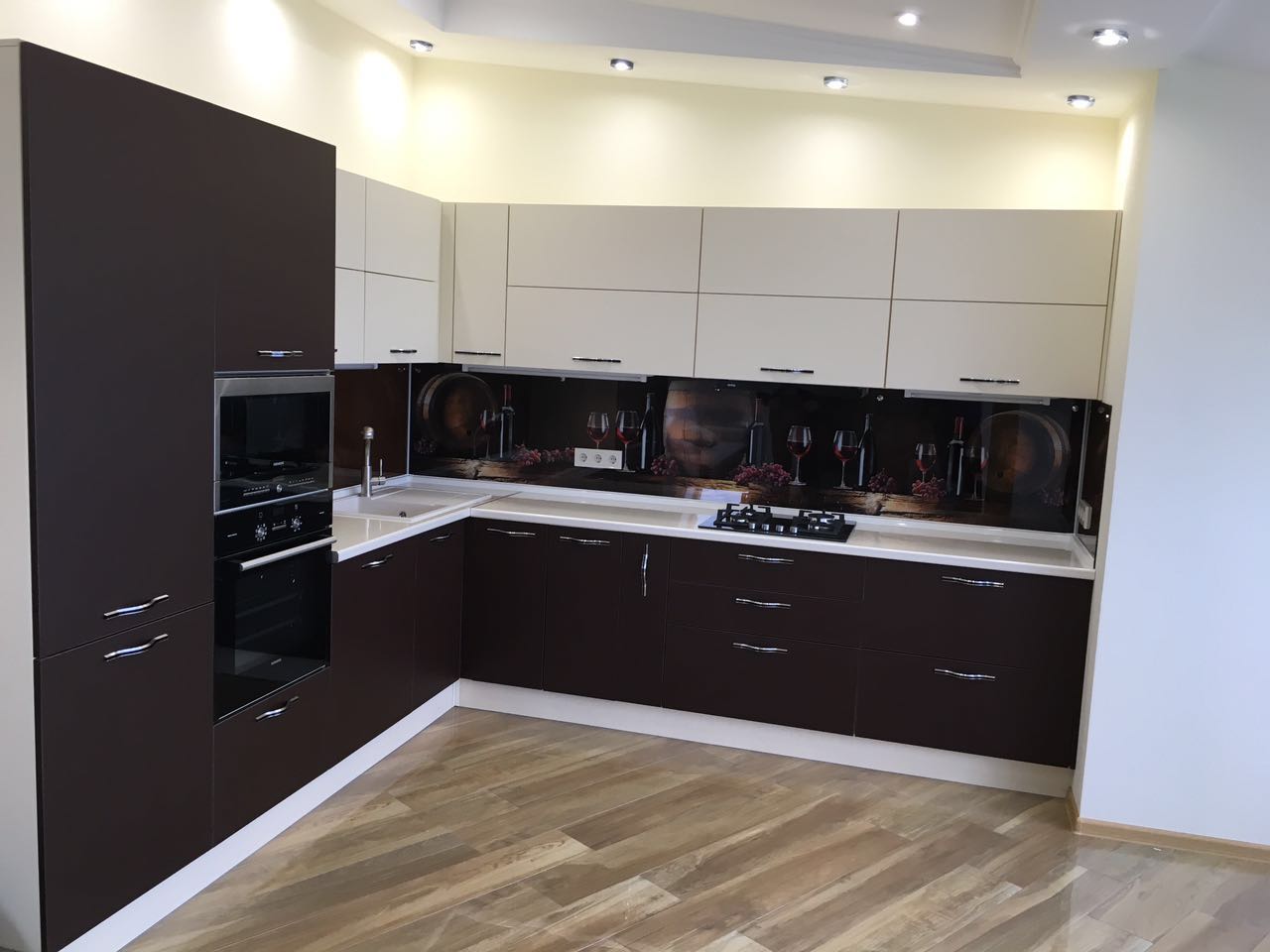Двухцветная угловая кухня со скинали