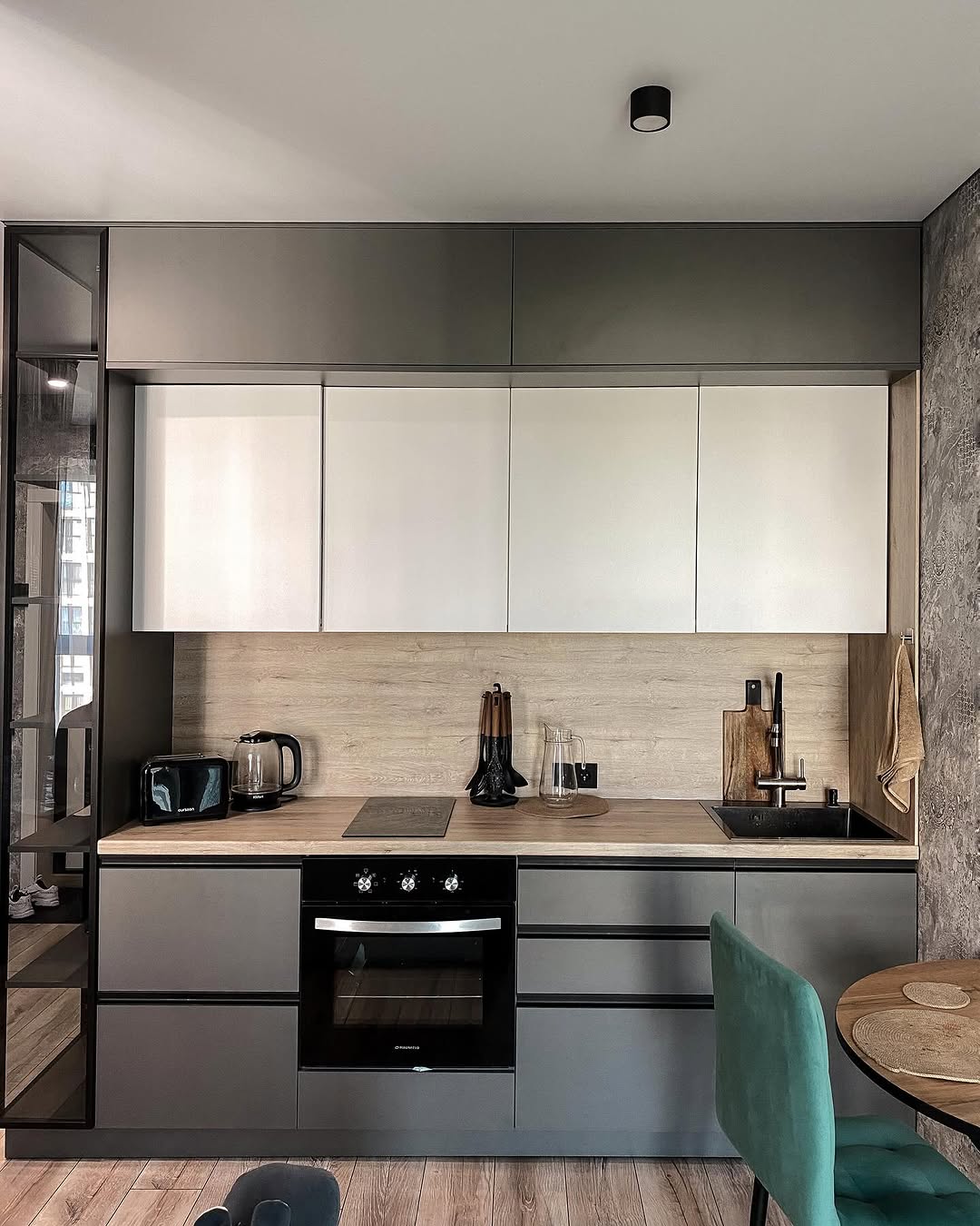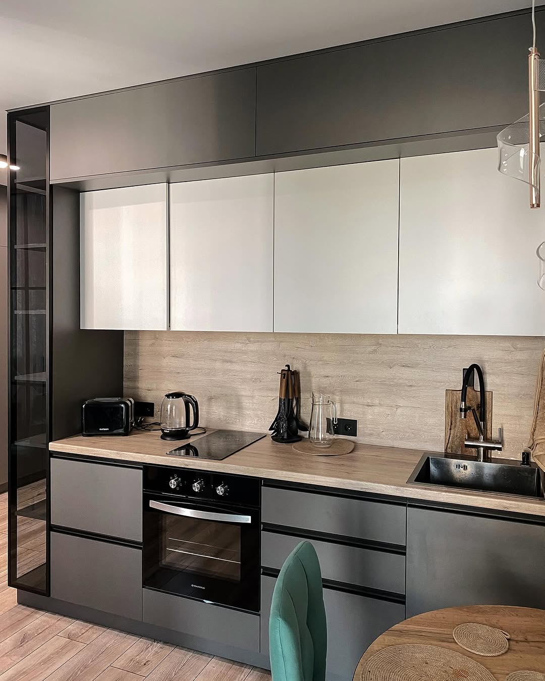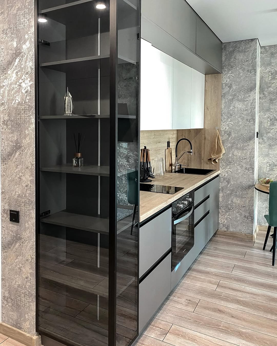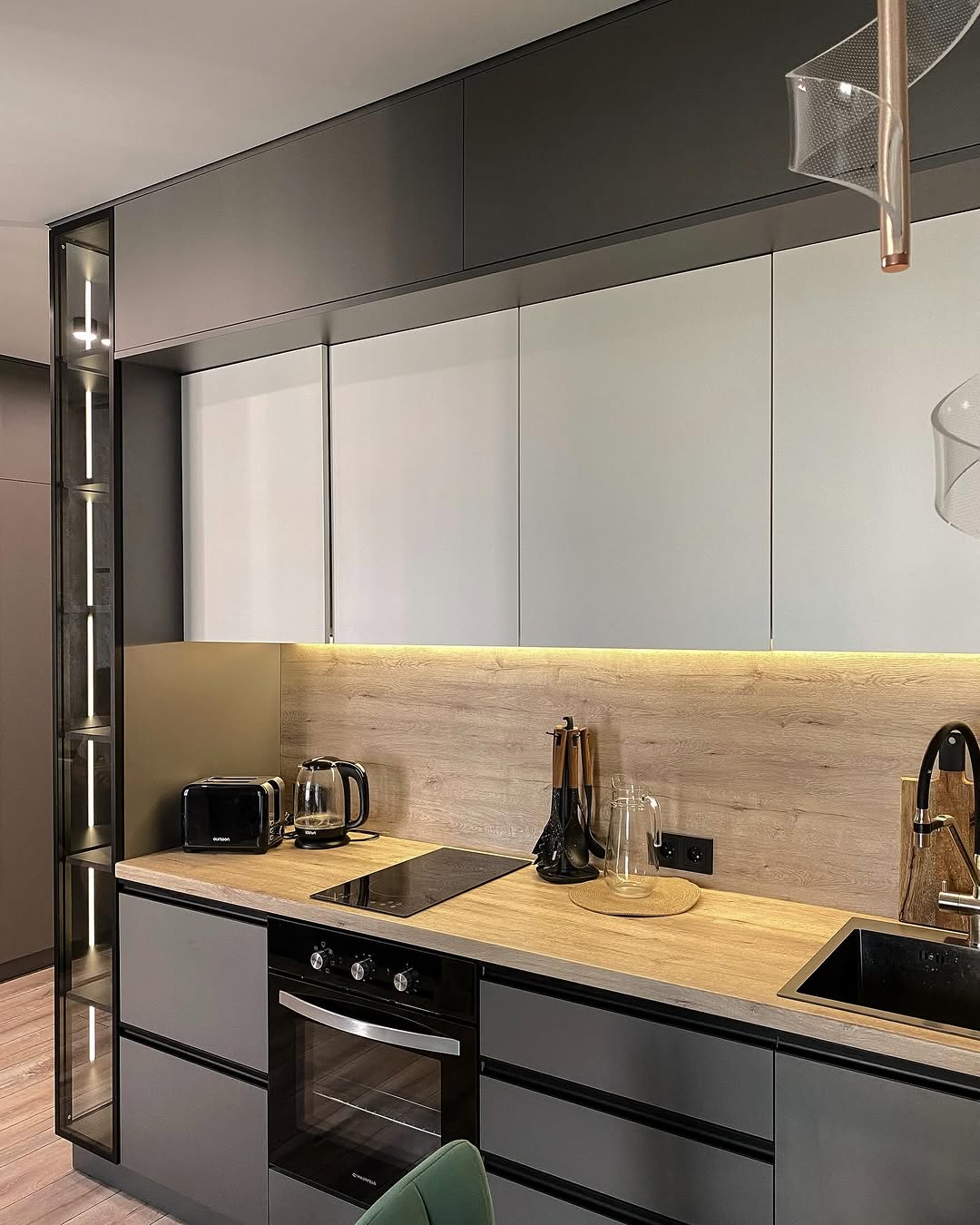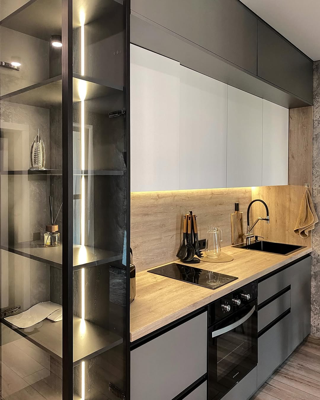Элегантная кухня с витриной и мягкими контрастами — современный вариант, который подойдёт как для городской квартиры, так и для студии. Встроенная подсветка и стеклянный шкаф создают атмосферу уюта и стиля.