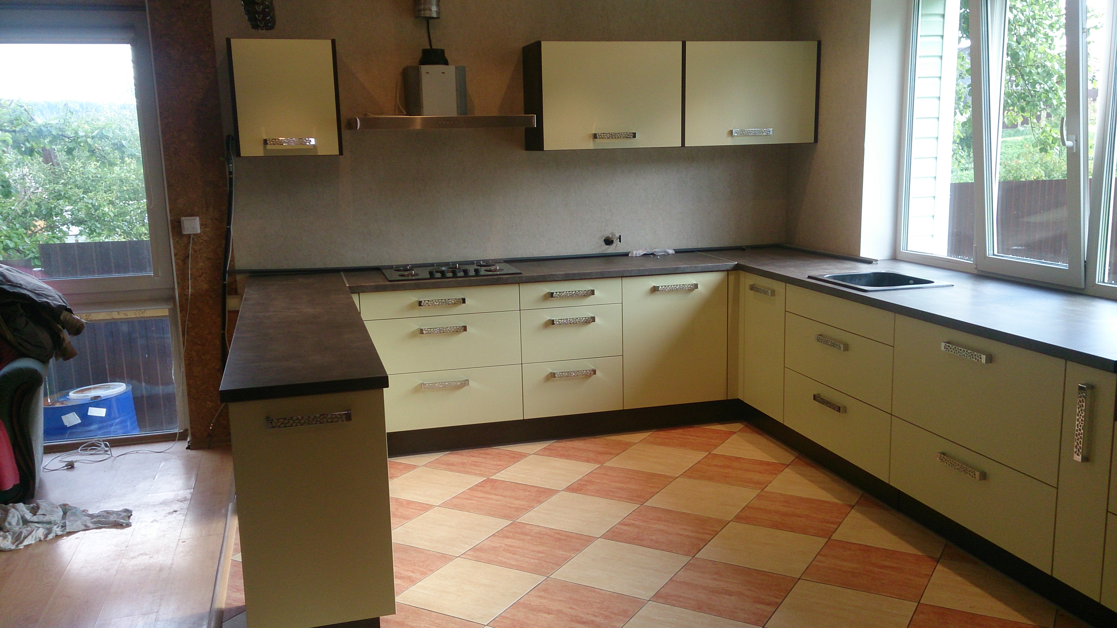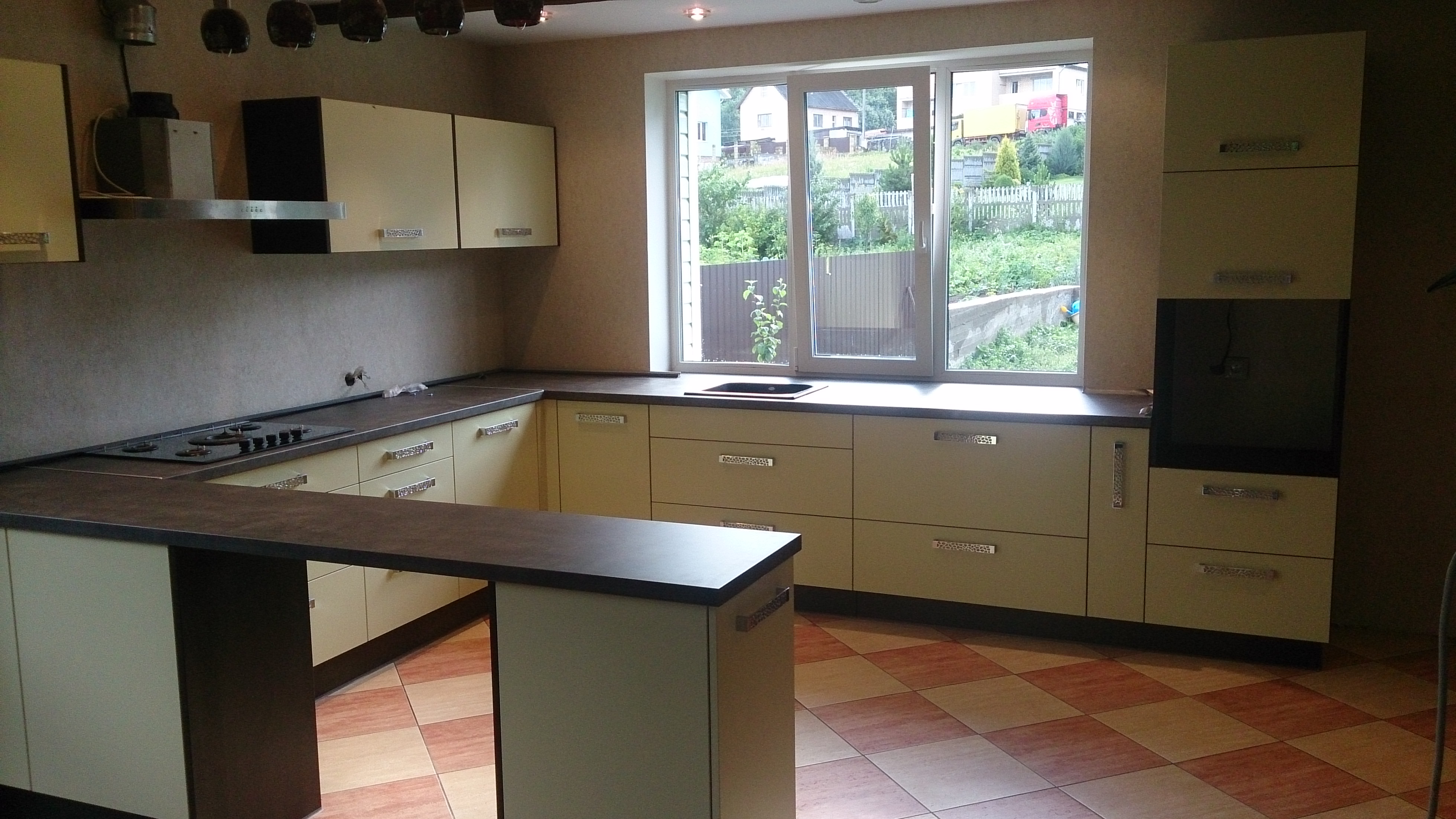 код 89599П-образная кухня со стойкой. Песочные фасады в коричневом корпусе в тон столешнице.