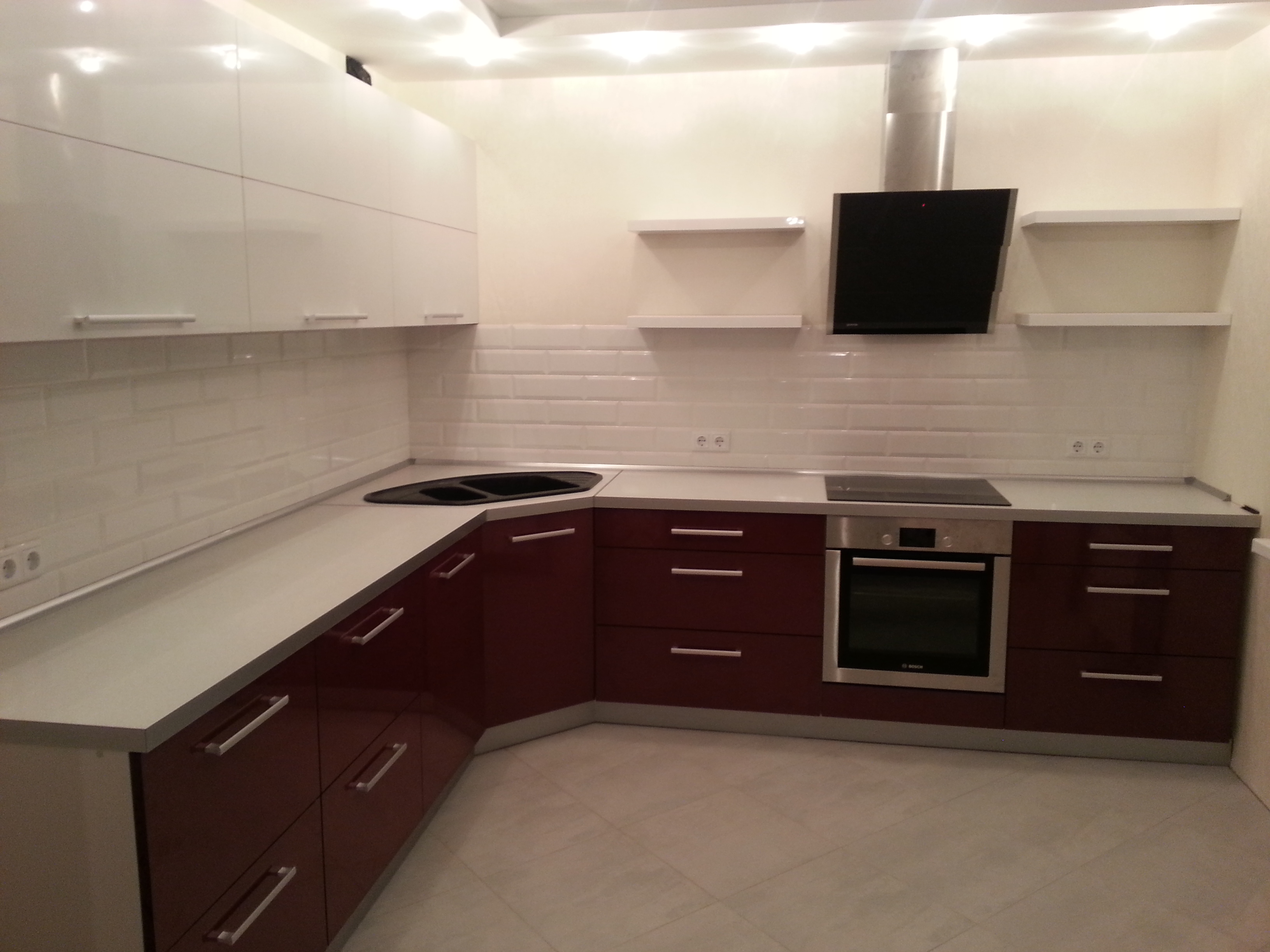код 86697Белый верх и светлая столешница. Низ вишневого цвета. Диагональный угол с мойкой.