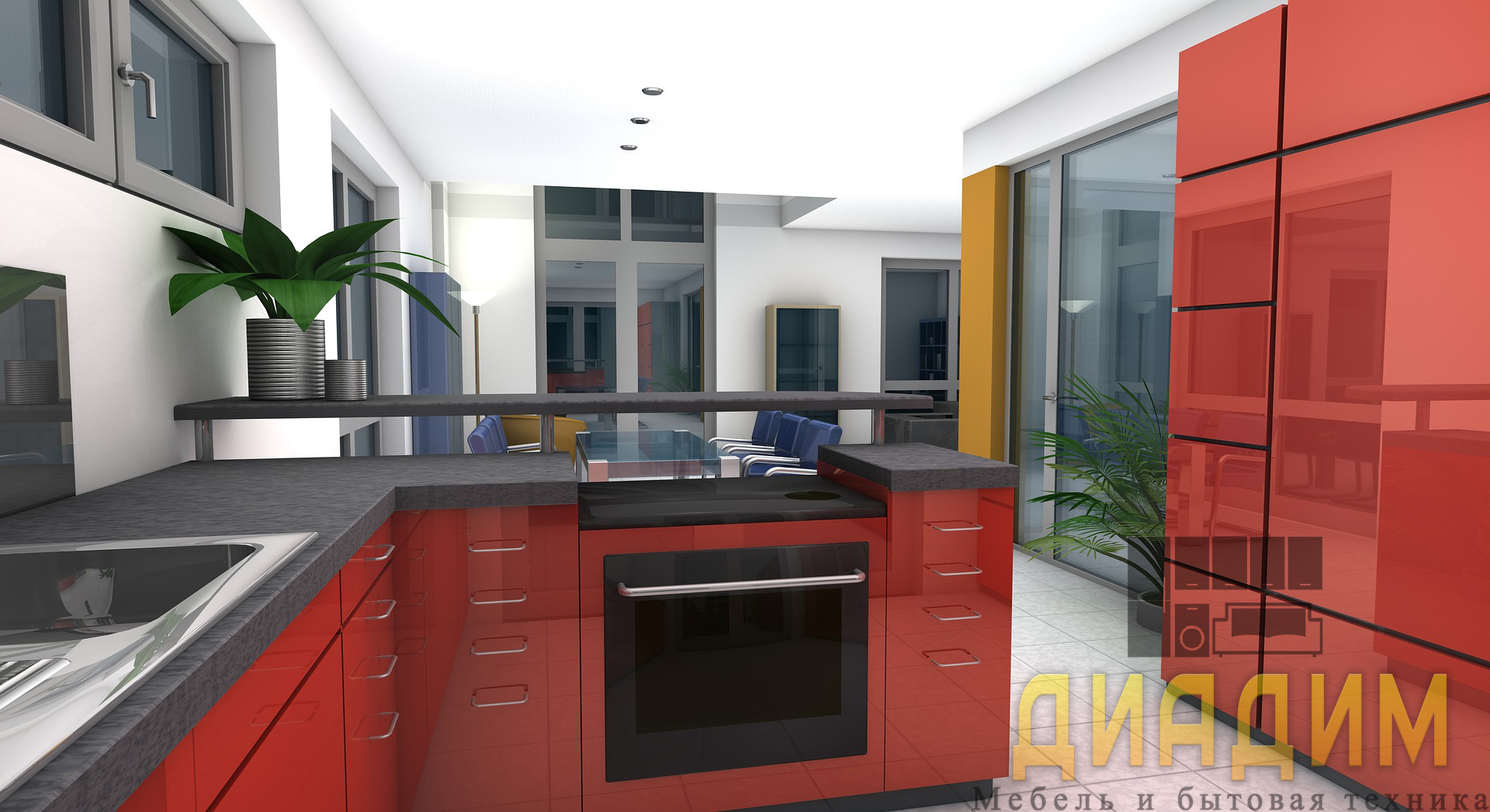 Фасады кухни выполнены в красном глянце. Столешница и декор цвета «мокрый асфальт», поэтому общий вид приобретает более приглушенный характер. Модель имеет модульную форму. Она удобна в эксплуатации, подойдет к интерьеру как офиса, так и квартиры.