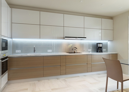 код 88659Линейная минималистичная кухня в фасадах без ручек: белый верх, низ под орех.