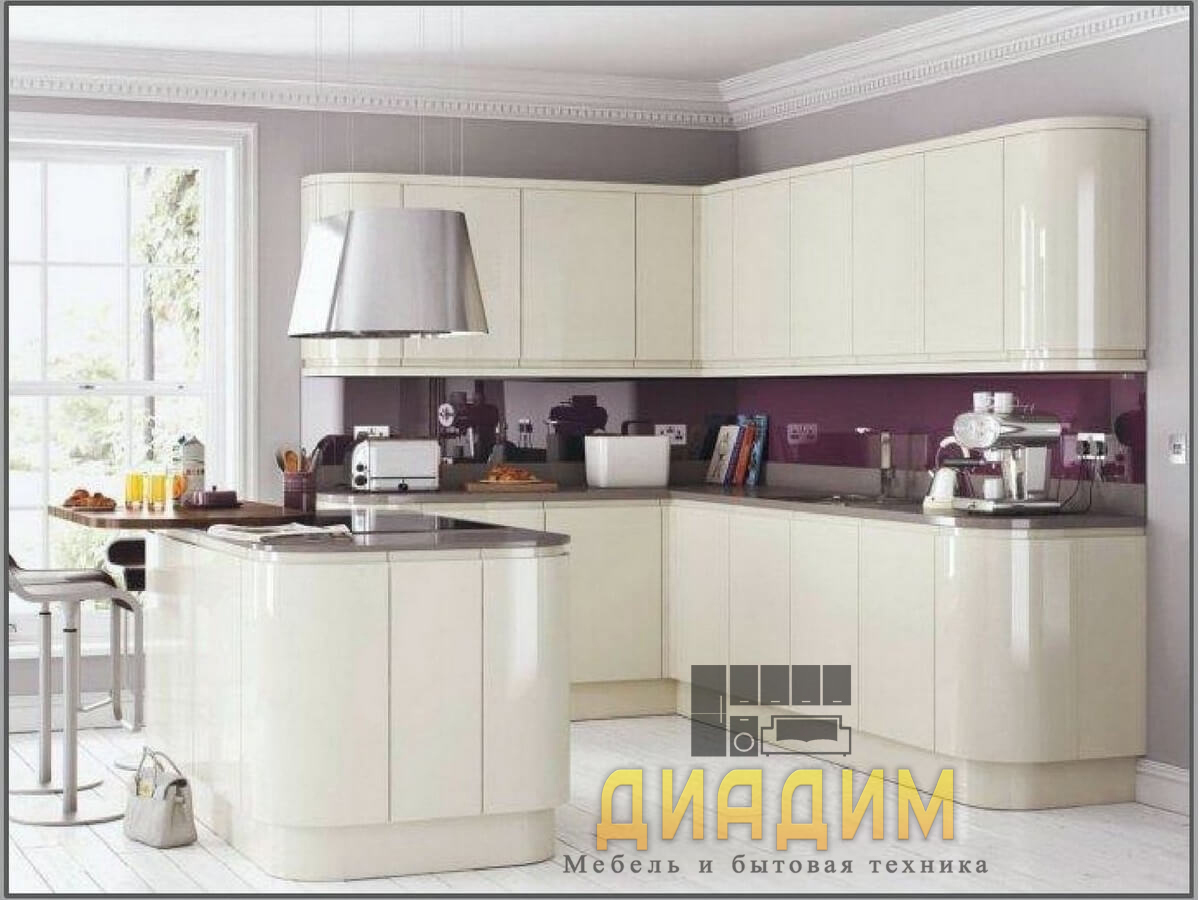 Модульная кухня с островом представлена в белом цвете с глянцевым переливом. Шкафы модели радиусные, что является большим плюсом: риск получения травмы снижен в несколько раз. Сама конструкция угловая. Столешница темного серого цвета выделяется на фоне белых фасадов.