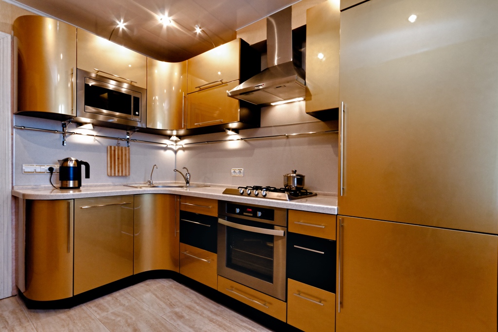 Кухня в золотистом оттенке с радиусным фасадом. Стильная кухня представлена в современном дизайне с насыщенной окраской, придающей кухне насыщенности и визуальную атмосферу богатства. Золотистый оттенок перемежается стильными черными вставками, которые стильно дополняют однородный фасад. Прочные ручки-скобки помогут легко открывать шкафчики и выдвигать ящики с кухонной утварью.
