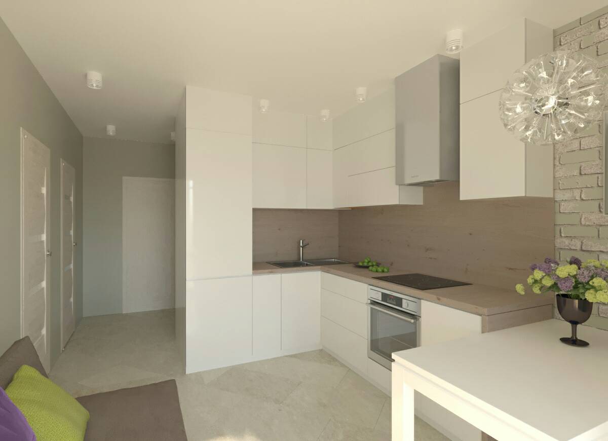 Угловая кухня нейтрального цвета с высокими верхними шкафами