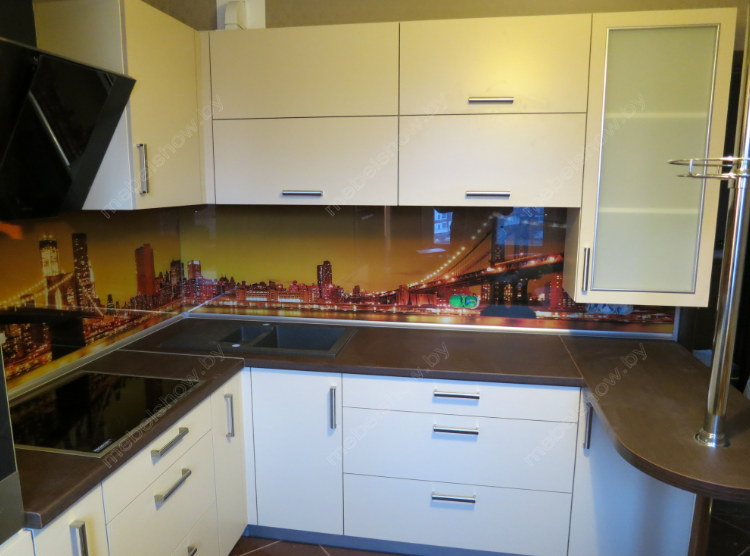 Стильная угловая кухня в полной комплектации. Фасады матовые с частичным остеклением сверху.