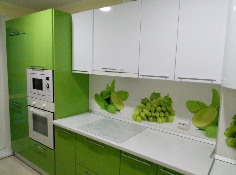 Сочный салатовый и воздушный белый цвета фасада придают модели линейной кухни современный вид и создают уютную атмосферу. Кухня дополнена специальными нишами для встраиваемой техники. Кухонный фартук декорирован фотопечатью с изображение фруктов, что придаст еще большего аппетита и уюта. Ручки выполнены из хромированного металла.