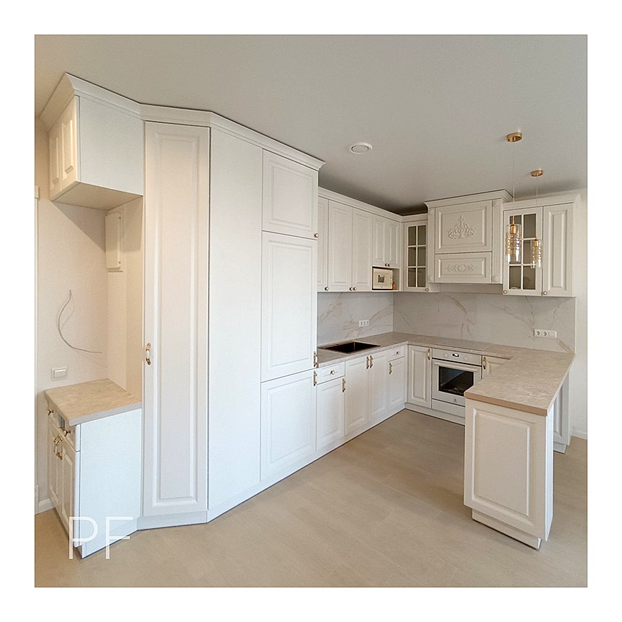 код 145616Кухня нестандартной формы с фрезерованными фасадами.