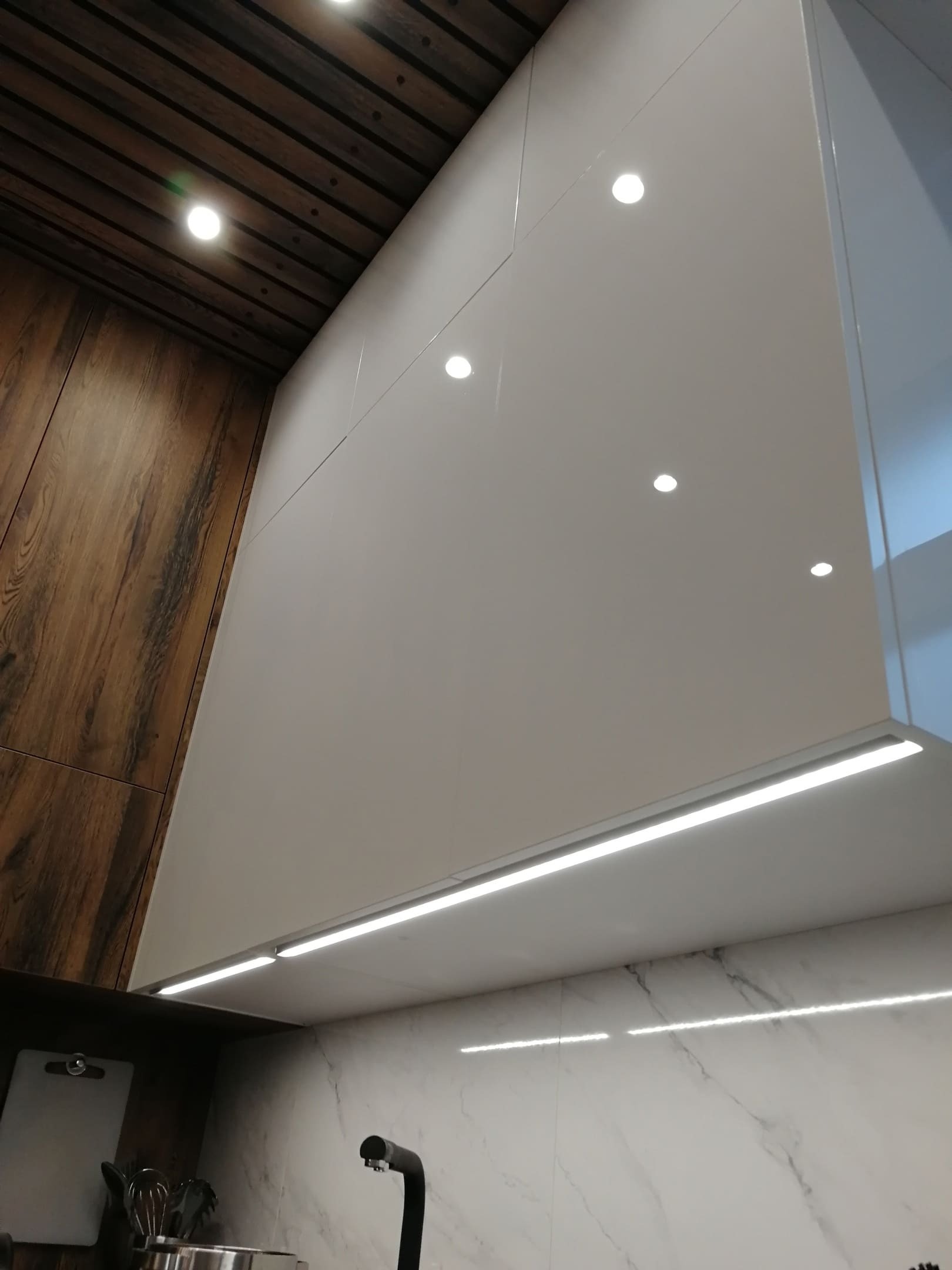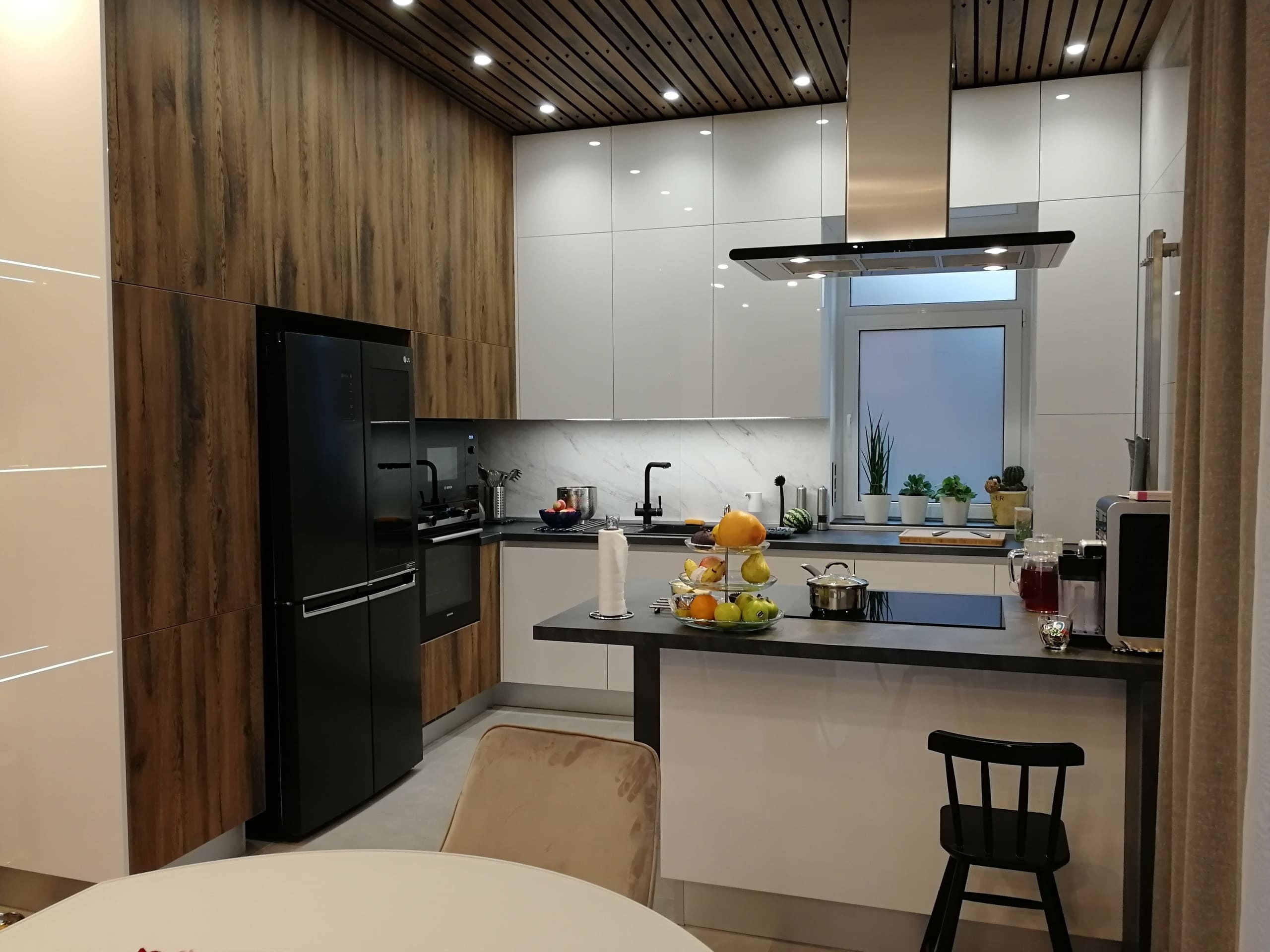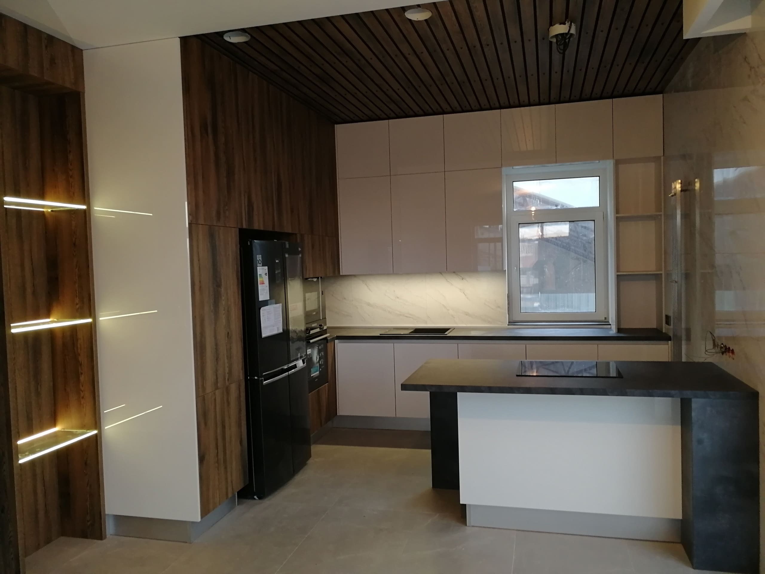 Фасады: пластик 3091gls с интегрированными ручками. Столешница: RESOPAL 4939-KS. Фурнитура: BLUM, BOYRD.