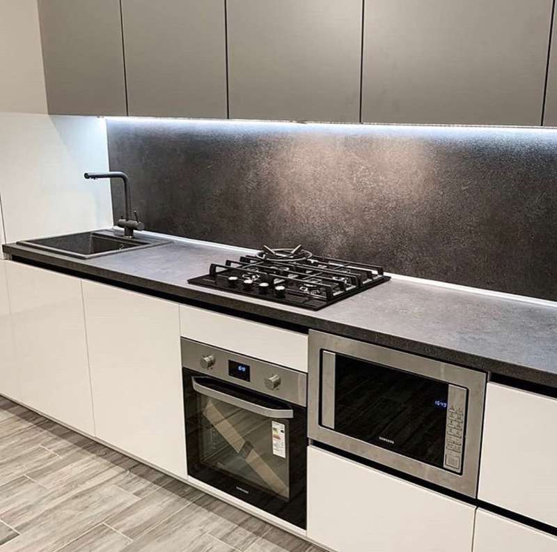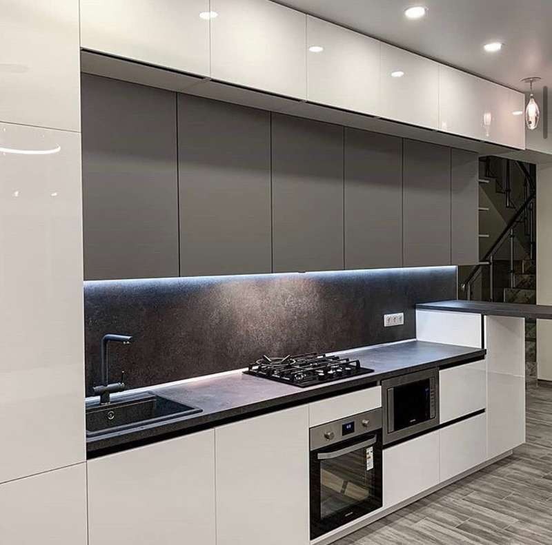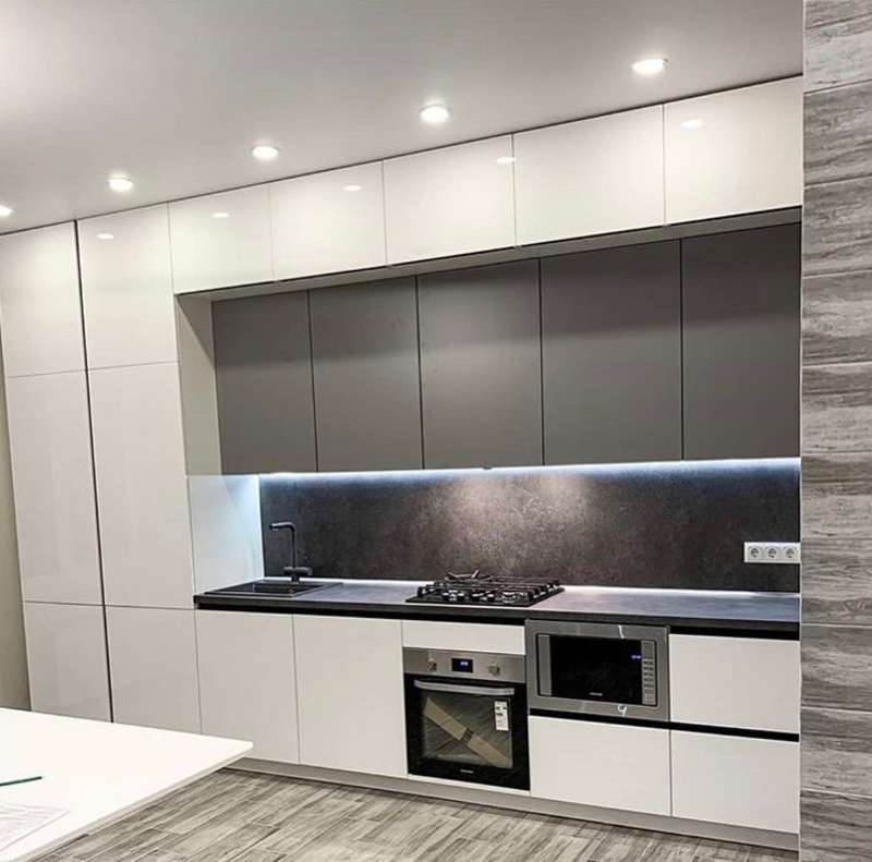 Комбинированная прямая кухня с глянцевыми пластиковыми фасадами