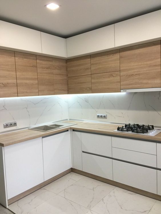 Комбинированная угловая кухня без ручек из ЛДСП