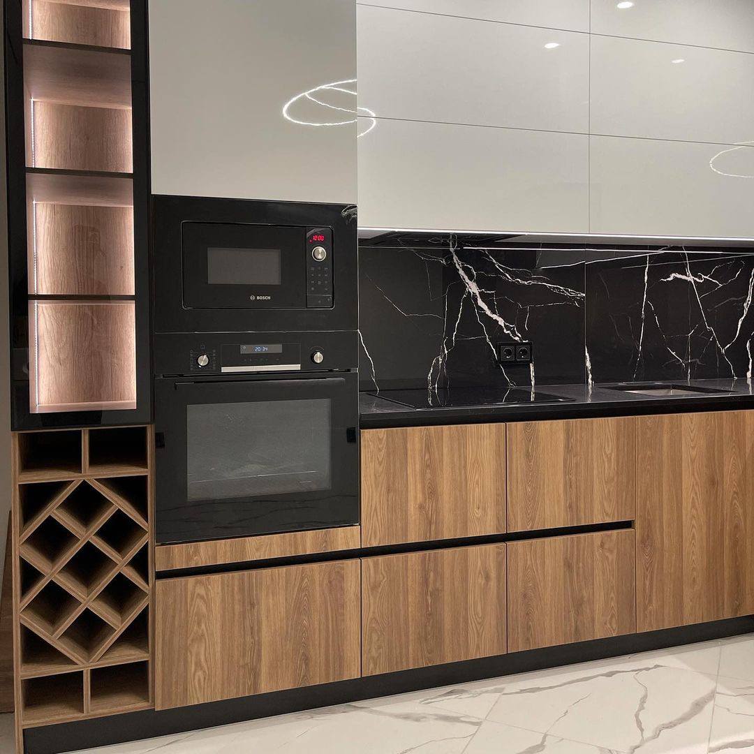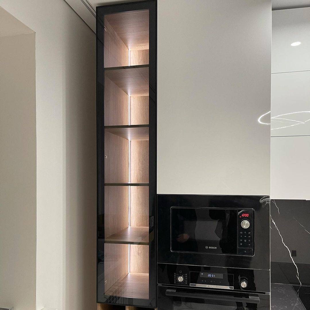 Светлые глянцевые фасады. современная и надежная фурнитура, ниши для техники.