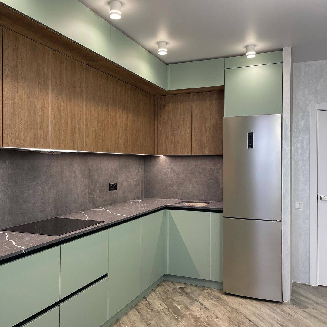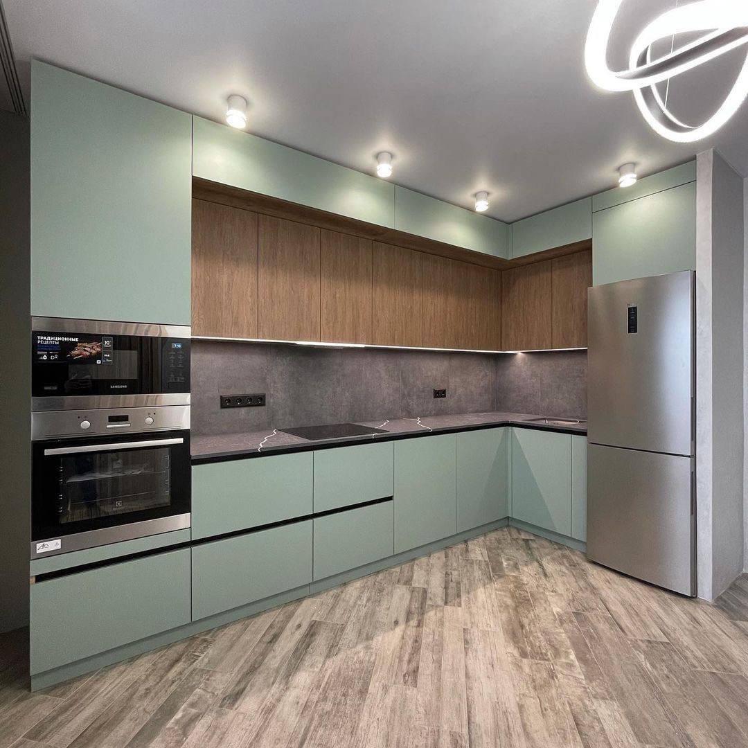 Комбинированная угловая кухня из крашеного МДФ и ДСП фасадов с ручкой gola-профиль