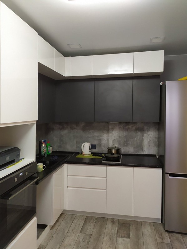 Комбинированная угловая кухня из крашеного МДФ с интегрированной ручкой