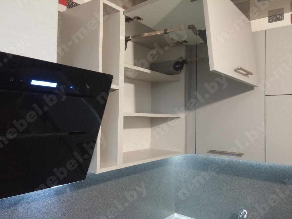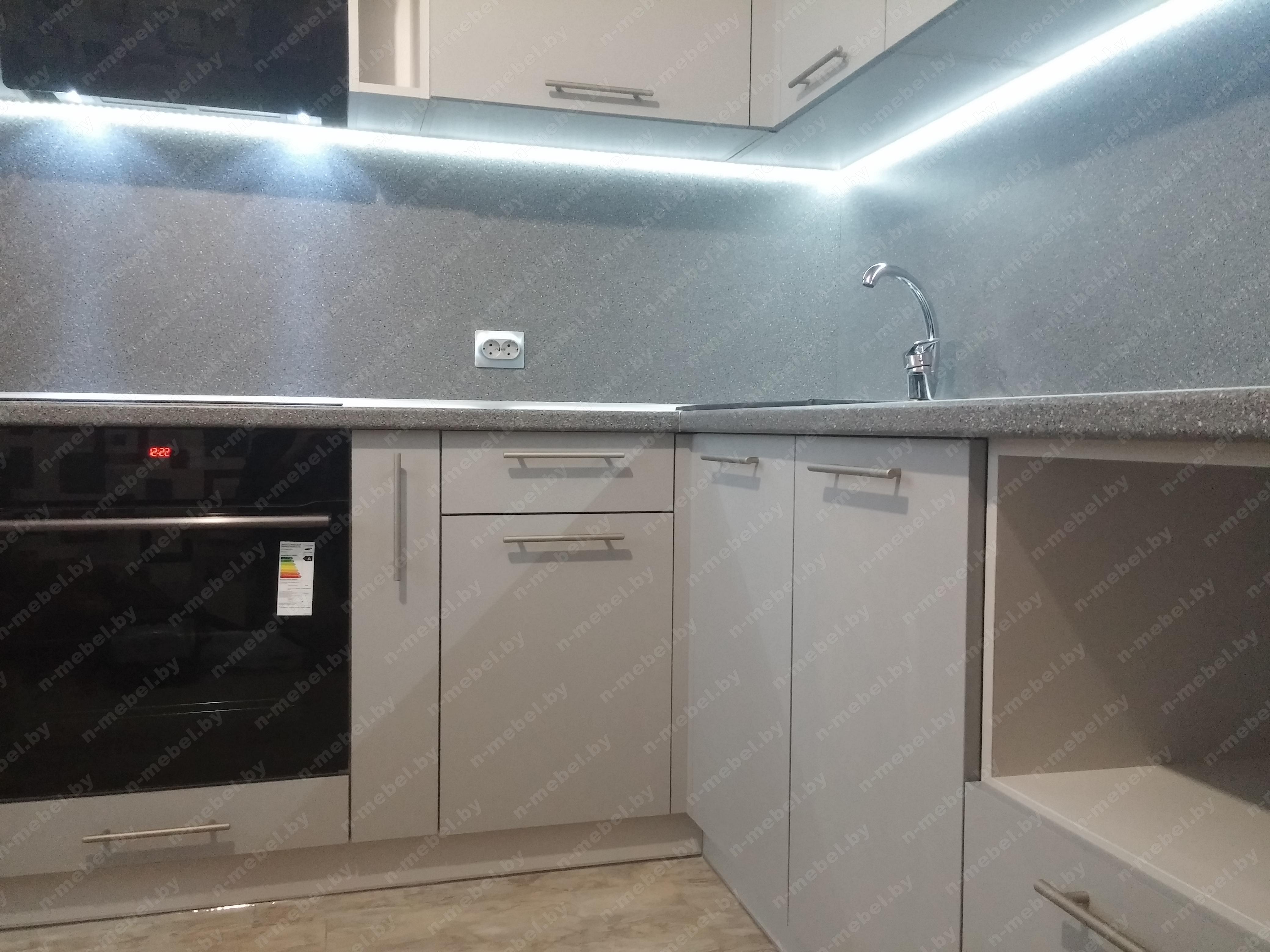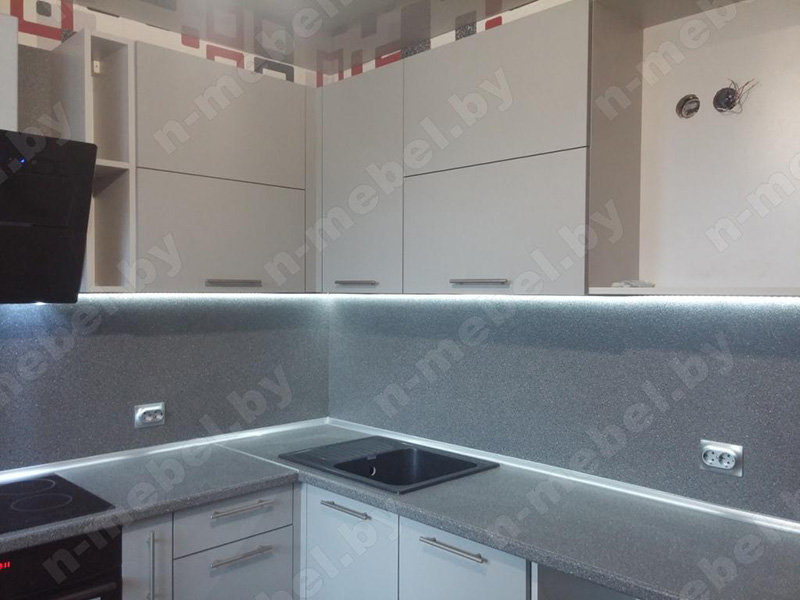 Современный угловой гарнитур подойдет для обустройства кухни любых размеров. В комплекте имеются шкафчики различных размеров для удобного хранения посуды и других кухонных принадлежностей. Также предусмотрено наличие открытых полочек для предметов декора. Специальная панель, выполненная в одном тоне со столешницей, защитит стенку от загрязнений и повреждений.