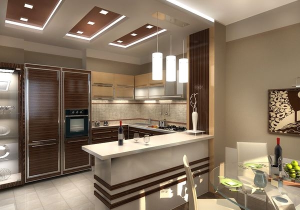 Угловой кухонный гарнитур с барной стойкой. Буфет со встроенным холодильником и духовым шкафом, а также нижние шкафчики выполнены тонах древесины зебрано в алюминиевом профиле и широкими ручками-рейлингами. Навесные модули в песочной расцветке, частично остеклены лакоматом с эффектной подсветкой. Корпус стойки украшен тремя параллельными полосками зебрано на белом фоне. Светлая столешница.