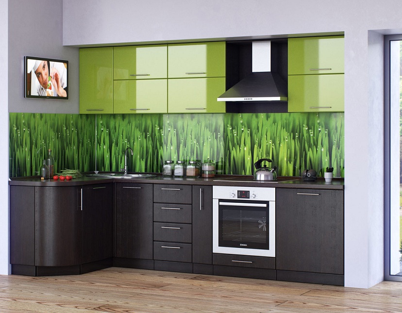 код 75342Металлические ручки. Фасад: салатовый глянец - венге. Красочные скинали.