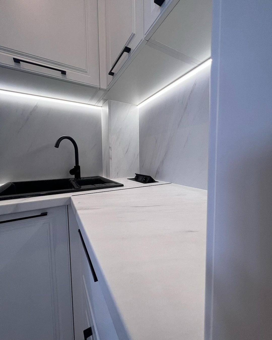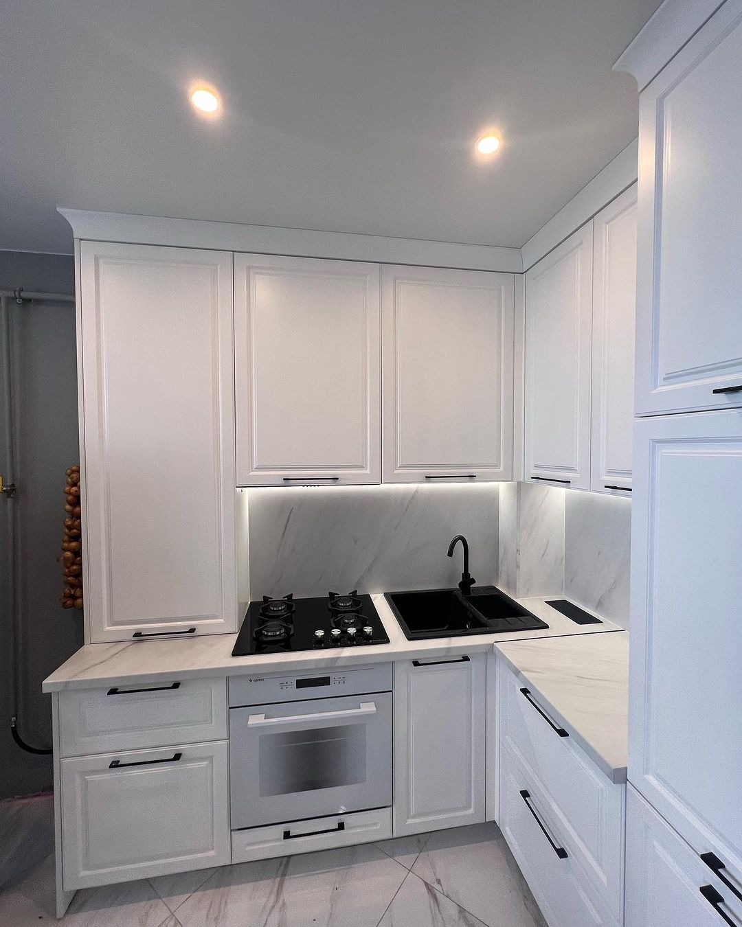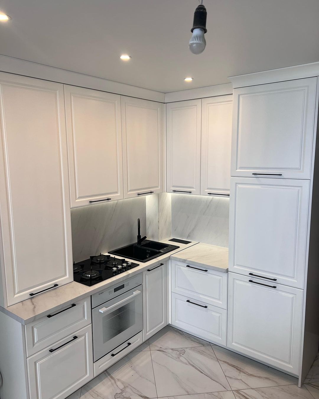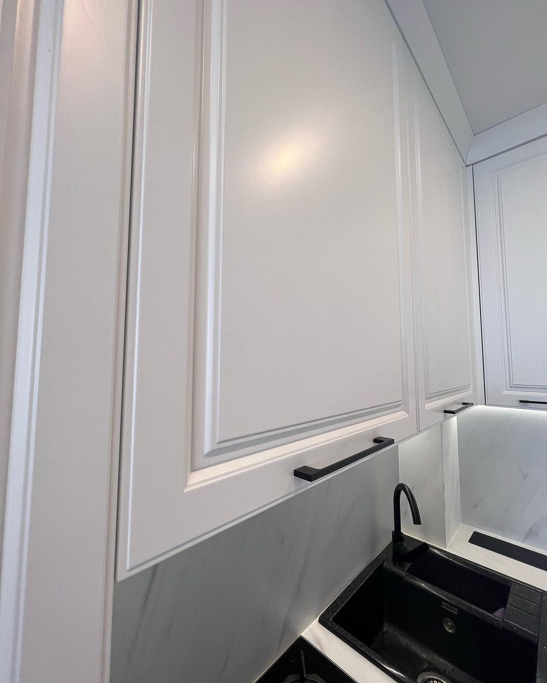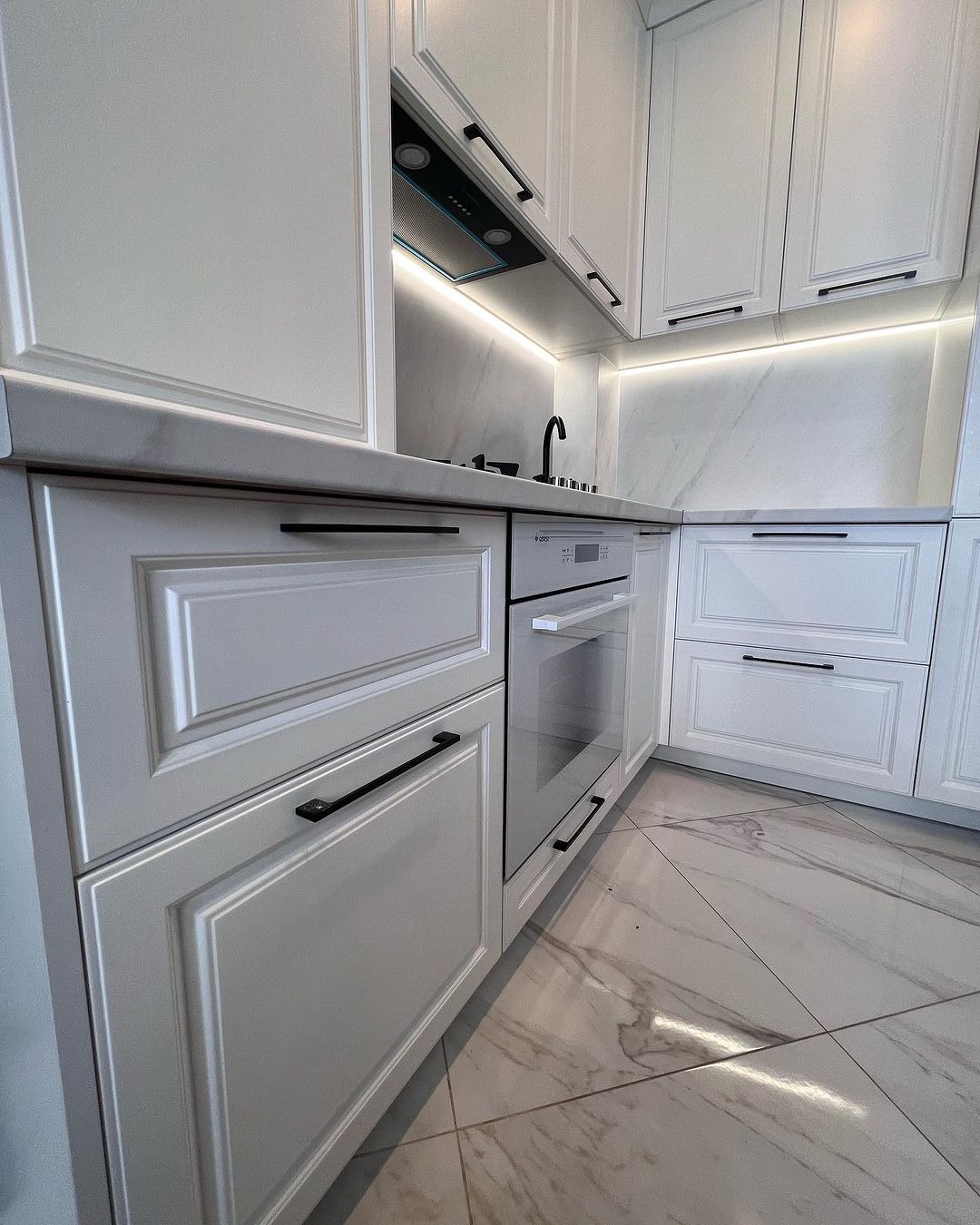 Удобные металлические ручки в цвете «сатин». Ширина кухни 140 см.