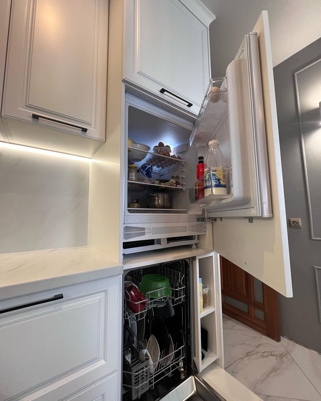 Комбинированные фасады, ниши для техники, качественные и долговечные материалы.