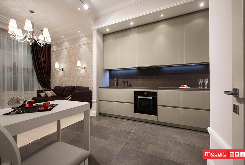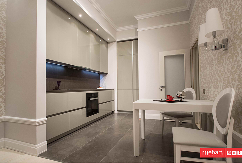 Современная кухня, выполненная в светлых тонах, представлена в виде линейной конструкции. Вся кухня укомплектована надежной металлической фурнитурой. Глянцевые створки напольного ряда представлены в сером цвете.
