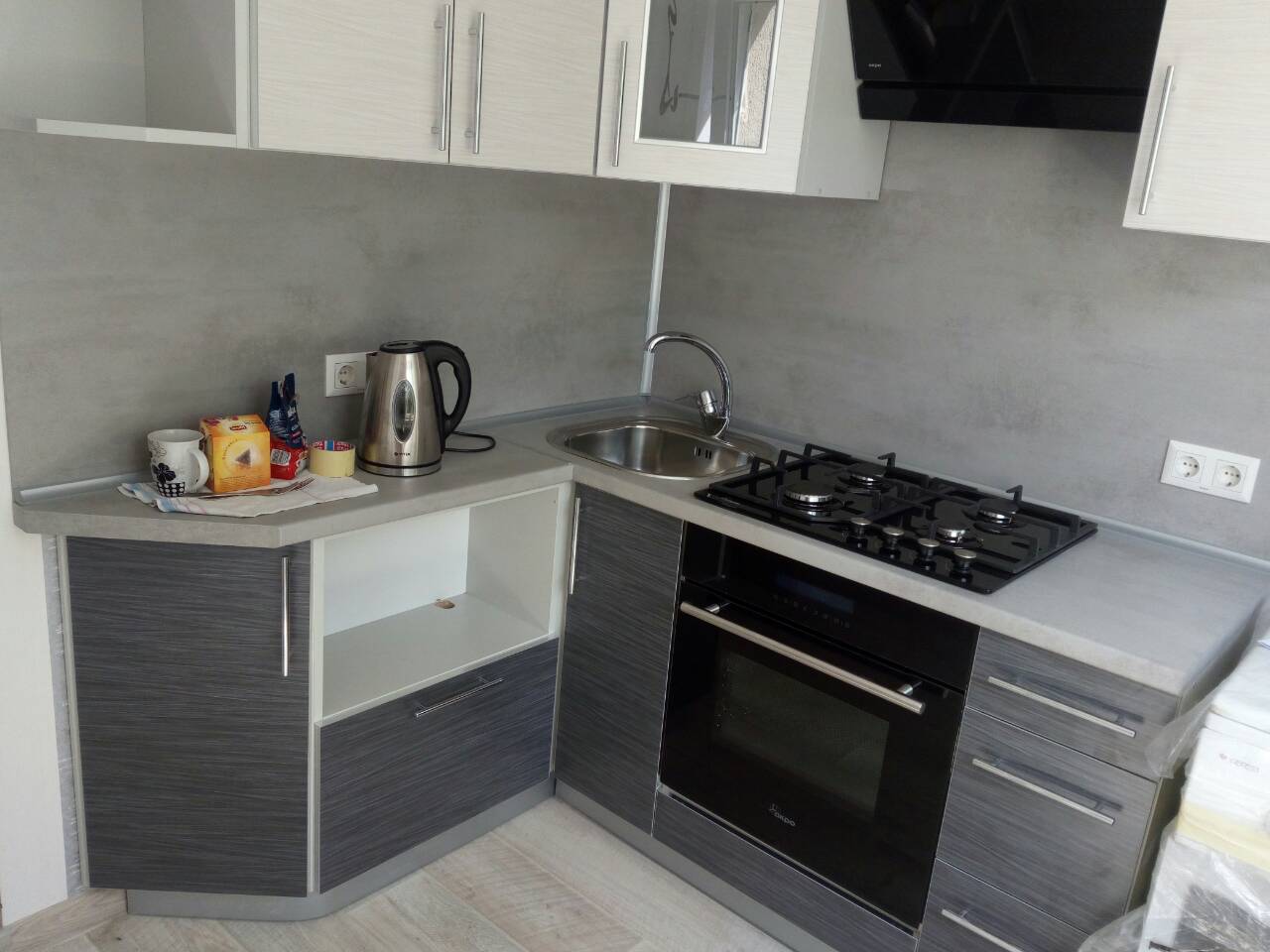 Готовый гарнитур с комбинированными фасадами из ЛДСП. Ширина кухни 180 см.