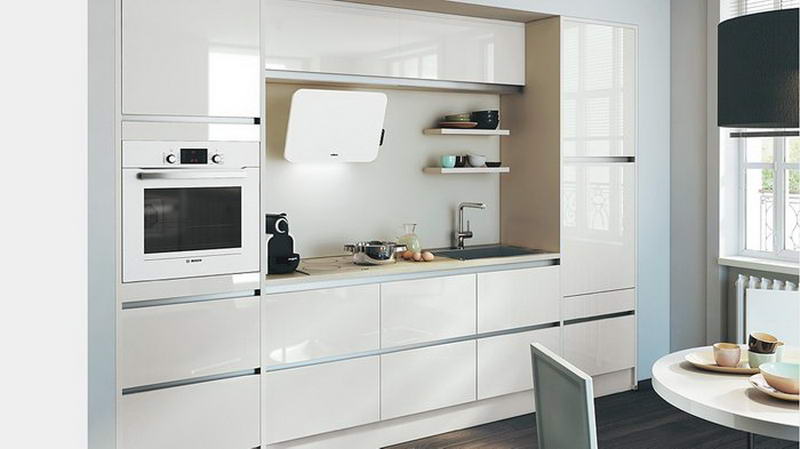 Линейная кухня предназначена для очень современных интерьеров в стиле минимализм, скандинавский, техно или даже фьюжн. Компактная линейная конструкция встроена в стену в стене, что максимально экономит пространство и не давит наличием множества закрытых шкафчиков и открытых полок. Компоновка модели выполнена под определенные габариты помещения, поэтому рабочая поверхность небольшая. Фасад имеет глянцевую поверхность и белый цвет, что важно для визуального увеличения площади. Ручки на фасадах заменены удобными выемками.